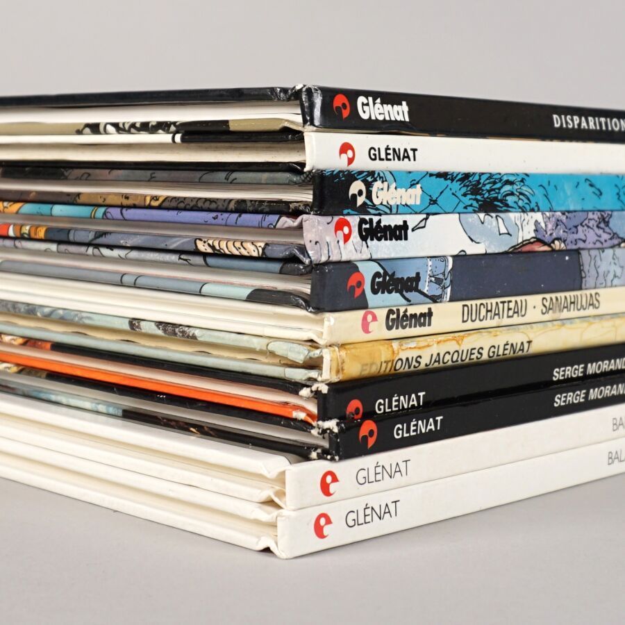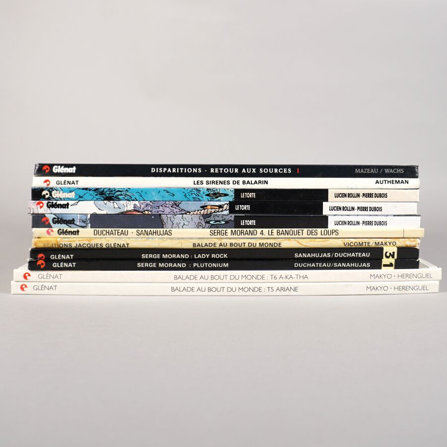 Éd. GLÉNAT : Ensemble de 11 albums comprenant BALADE AU BOUT DU MONDE (tomes 1 en petit format, 5 et 6 en grand format), SERGE MORAND (tomes 1, 3 et 4), LE TORTE (tomes 2, 4 et 5), "Disparitions-retour aux sources" et "Les sirènes de Balarin".