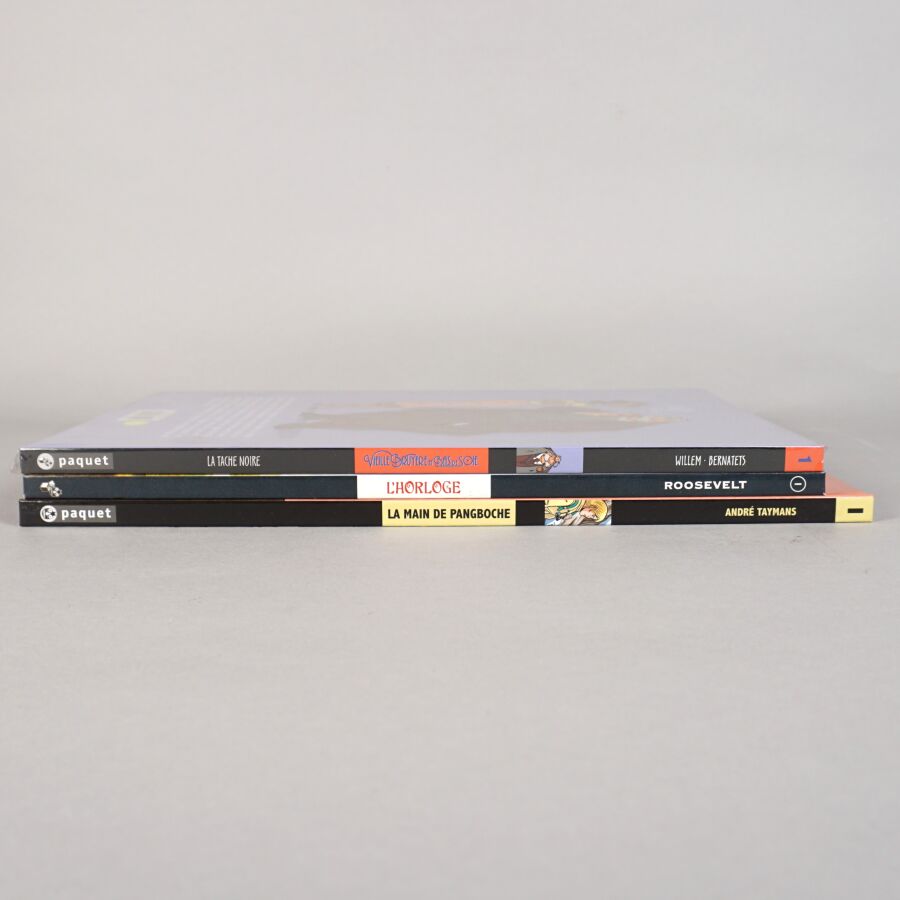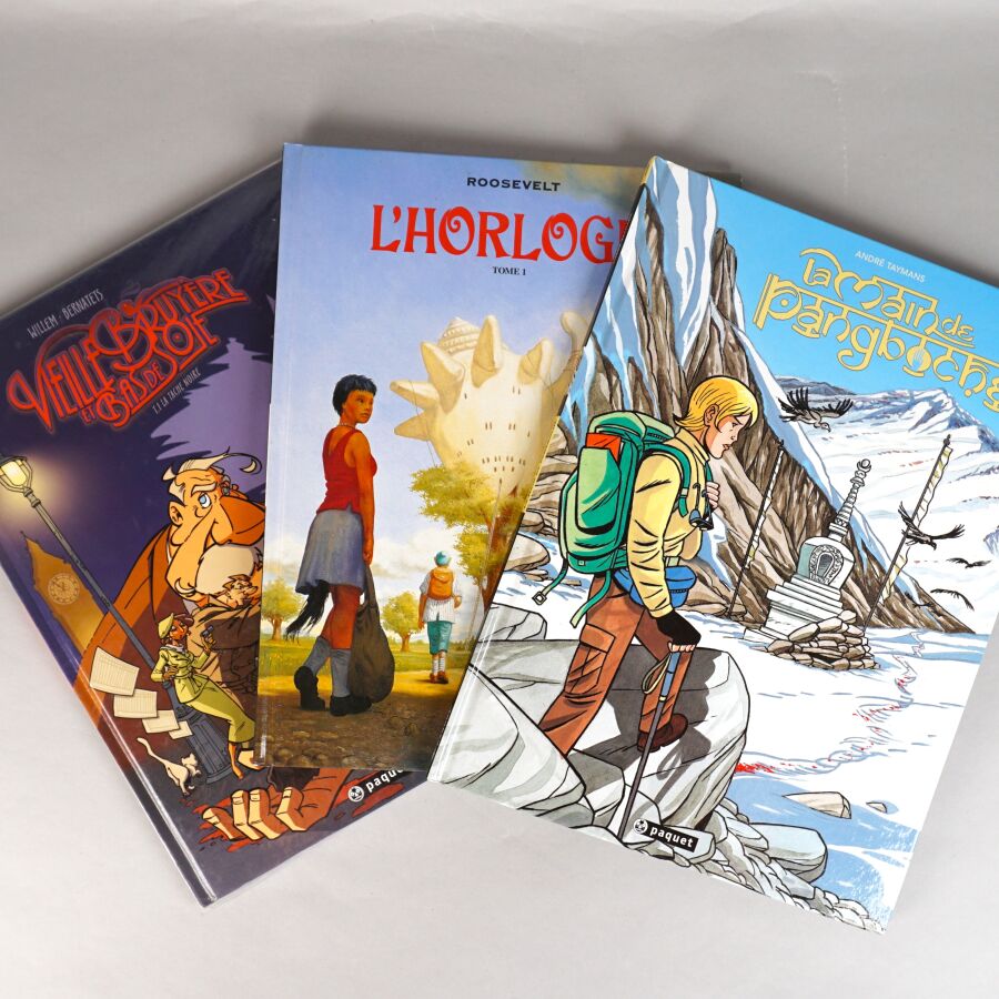 Éd. PAQUET : Ensemble de 3 albums comprenant VIEILLE BRUYERE ET BAS DE SOIE (tome 1, dédicacé par WILLEM), LA MAIN DE PANGBOCHE (tome 1, dédicacé par André TAYMANS et accompagné d'un ex-libris) et L'HORLOGE (tome 1).