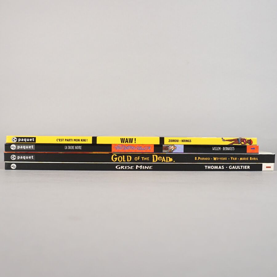 Éd. PAQUET : Ensemble de 4 albums comprenant VIEILLE BRUYERE ET BAS DE SOIE (tome 1, dédicacé par WILLEM), "Gold of the dead", GRISE MINE (tome 1) et WAW ! (tome 1).