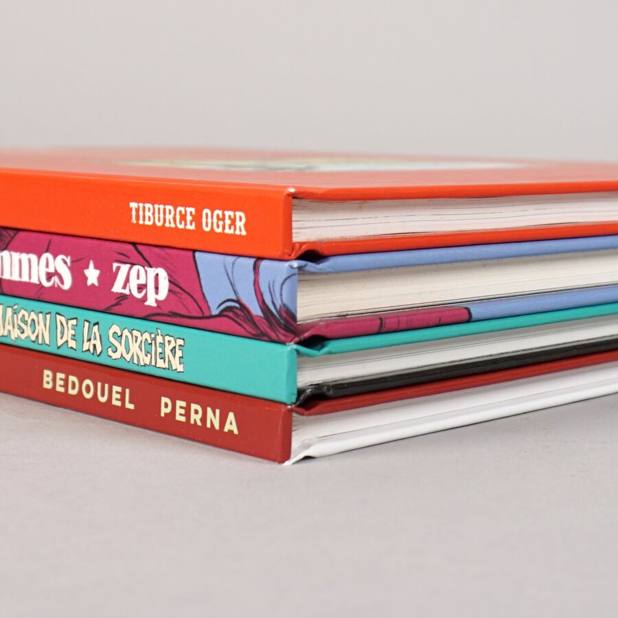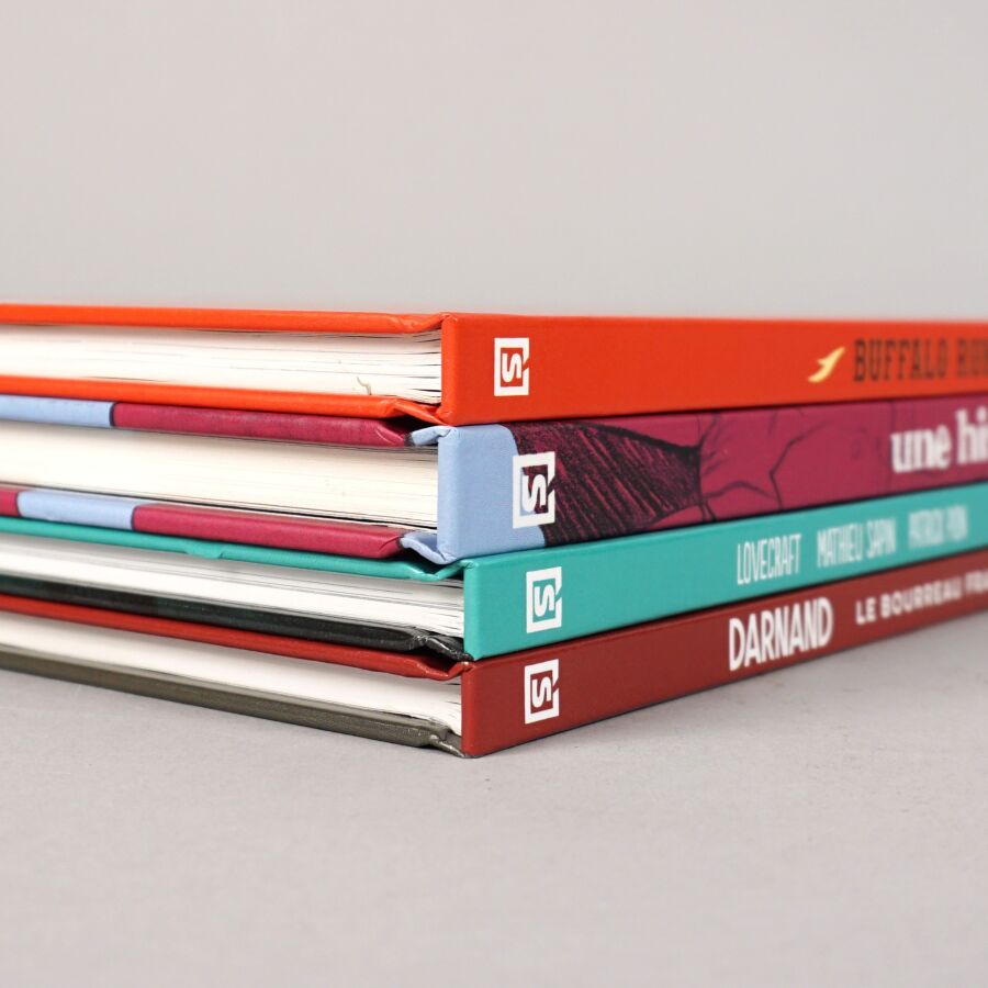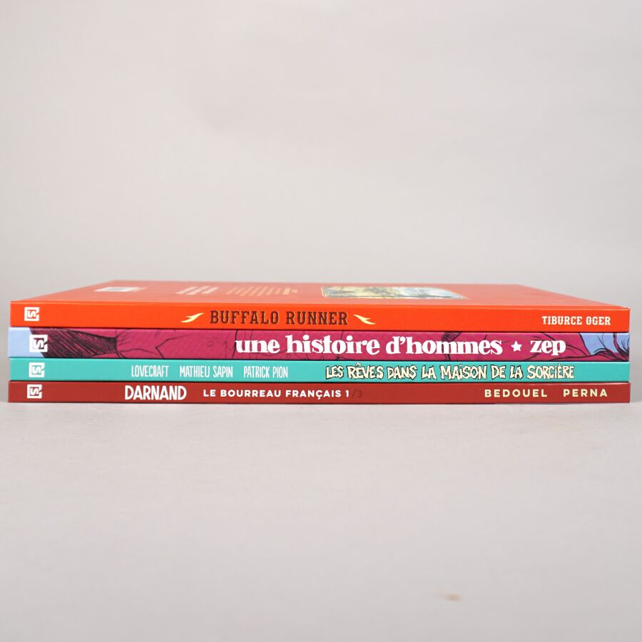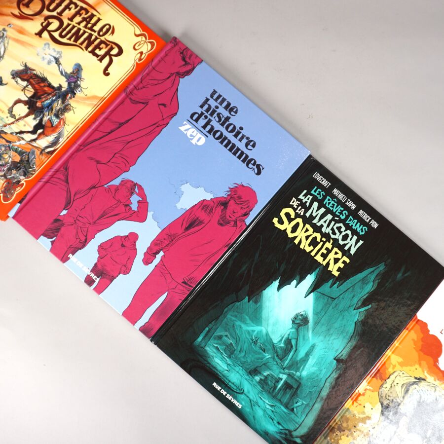Éd. RUE DE SEVRES : Ensemble de 4 albums comprenant "Une histoire d'hommes" (timbré, numéroté, limité à 250 exemplaires, signé par ZEP et accompagné d'un ex-libris), "Buffalo runner" (histoire complète), "Les rêves dans la maison de la sorcière" (doublement dédicacé par Mathieu SAPIN et Patrick PION) et DARNAND (tome 1).