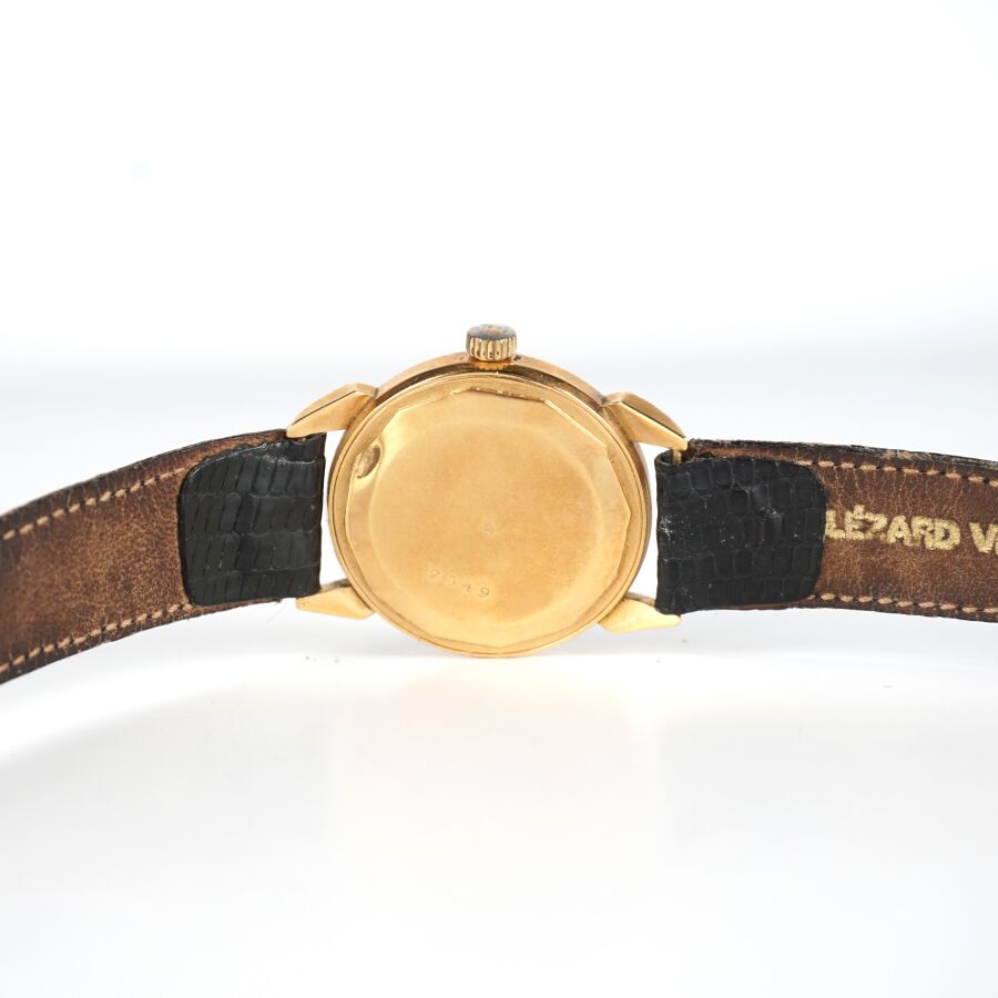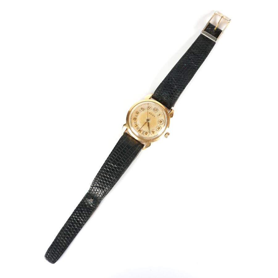 EDDY : Montre bracelet , boîtier en or jaune 18K (750/oo), cadran beige ocre signé, chiffres arabes pour les heures, couronne latérale crantée, fond numéroté 2349, bracelet en cuir noir et boucle ardillon en métal (rapporté), Diam. Boîtier : 3.4 cm. Poids brut : 32.8 g environ (usures).