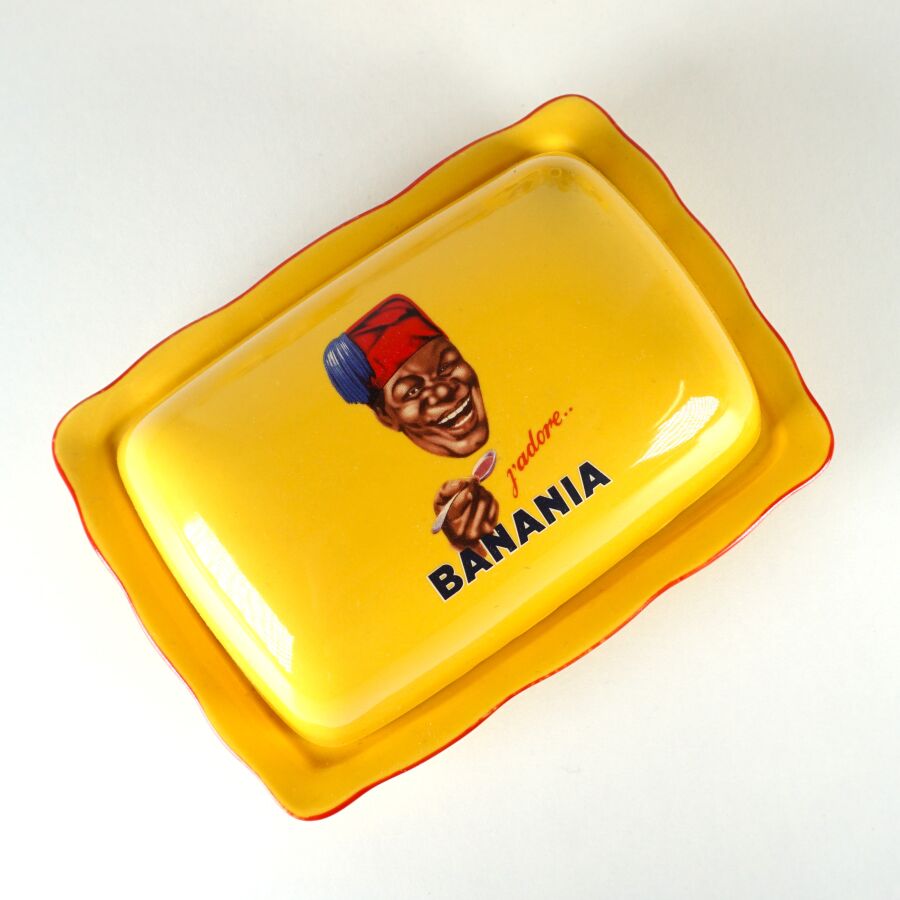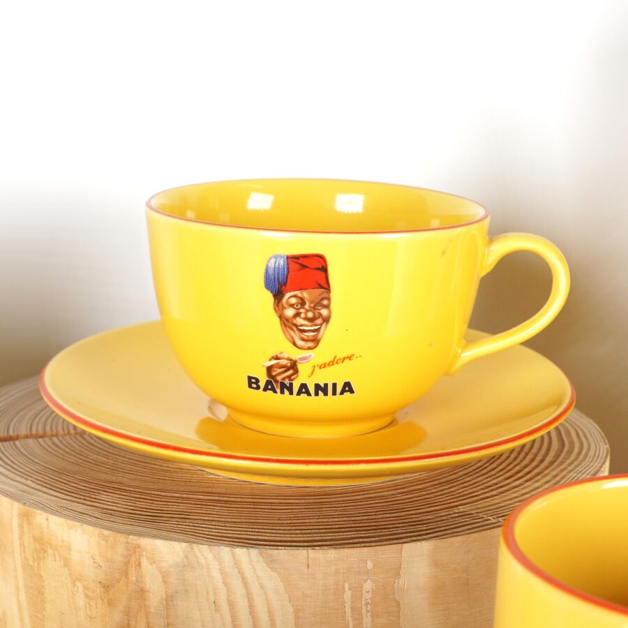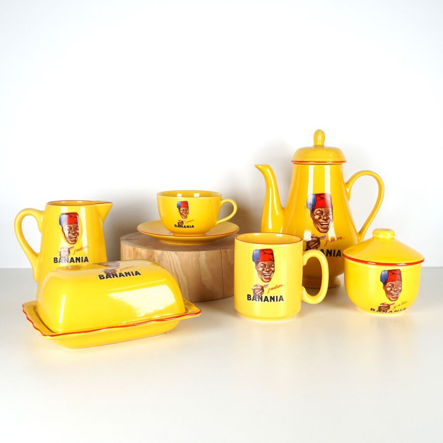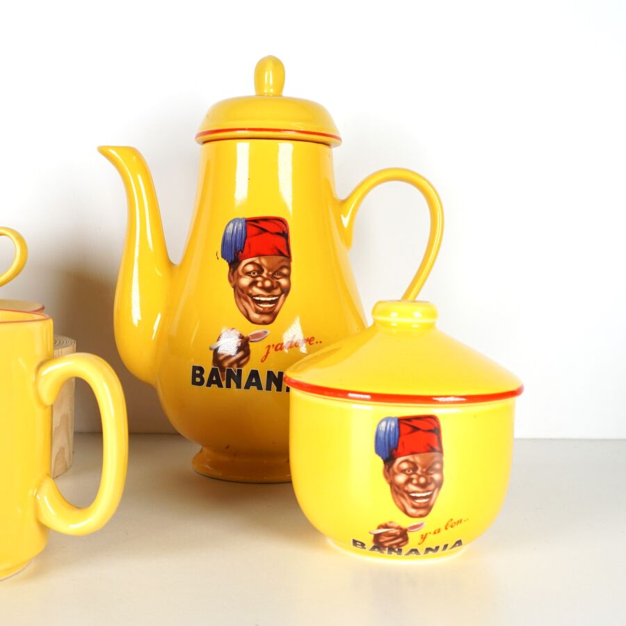 EDITIONS CLOUET - NUTRIAL : Partie de service à thé - café "Banania" en céramique émaillée polychrome à décor imprimé sur fond jaune comprenant : une verseuse, un pot-à-lait, un sucrier, un beurrier, une tasse et sa sous-tasse, un mug, marqués dessous, H. Verseuse : 25 cm. L. Beurrier : 17.5 cm.