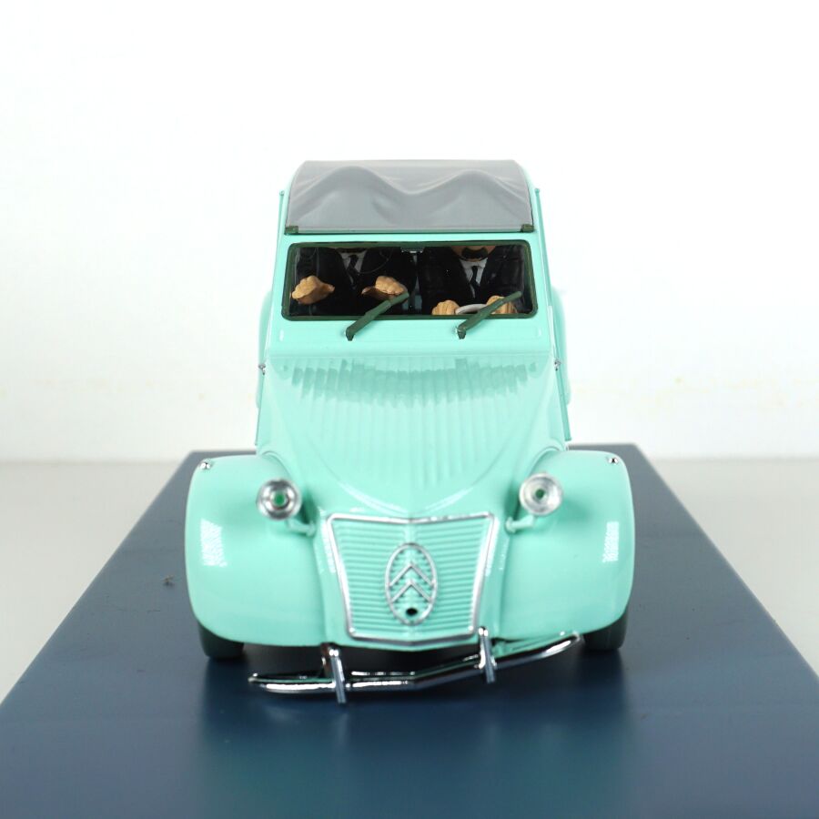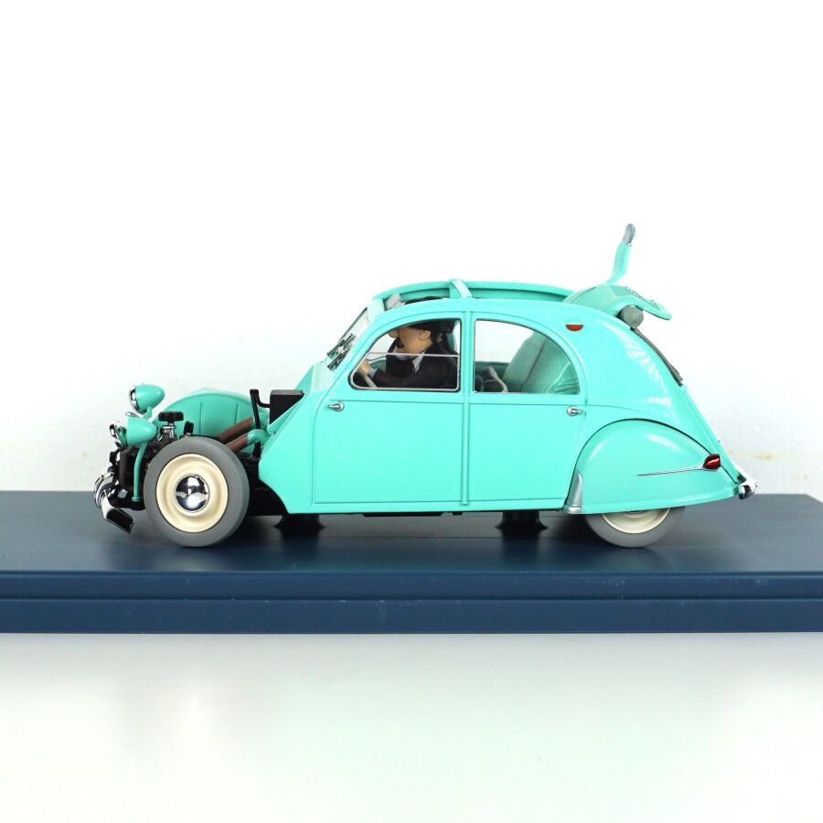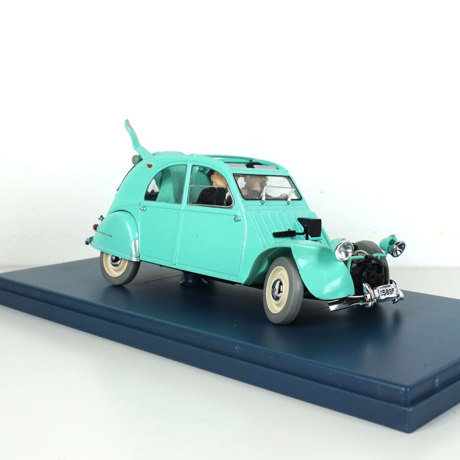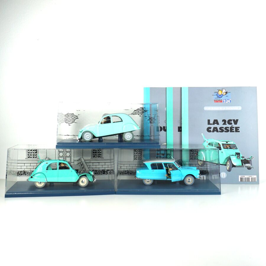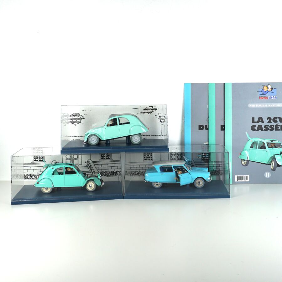 Éditions MOULINSART - HACHETTE : Ensemble de 3 véhicules "Les voitures de Tintin", échelle 1/24ème, comprenant (1) La 2CV des Dupont, "L'affaire Tournesol", réf. 29808, turquoise ; (1) L'ami 6 du docteur, "Les bijoux de la Castafiore", réf. 29818, bleue et (1) La 2CV cassée, "Les bijoux de la Castafiore", réf. 29811, turquoise, présentés dans leur boite vitrine et accompagnés du fascicule explicatif.
