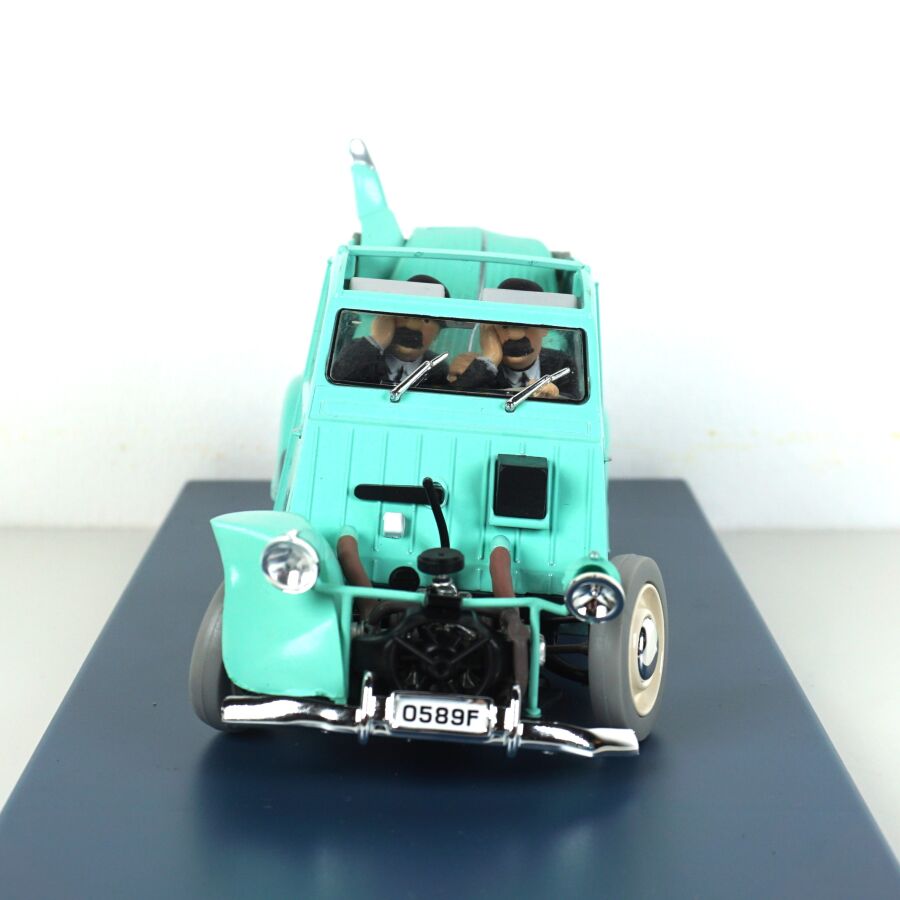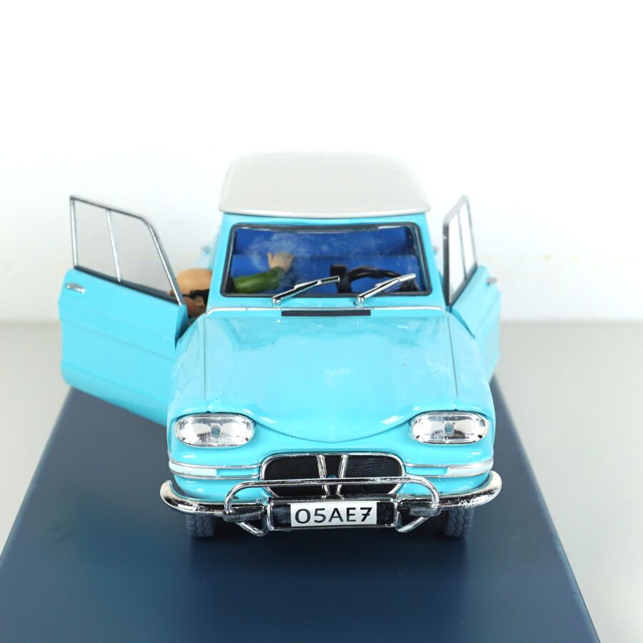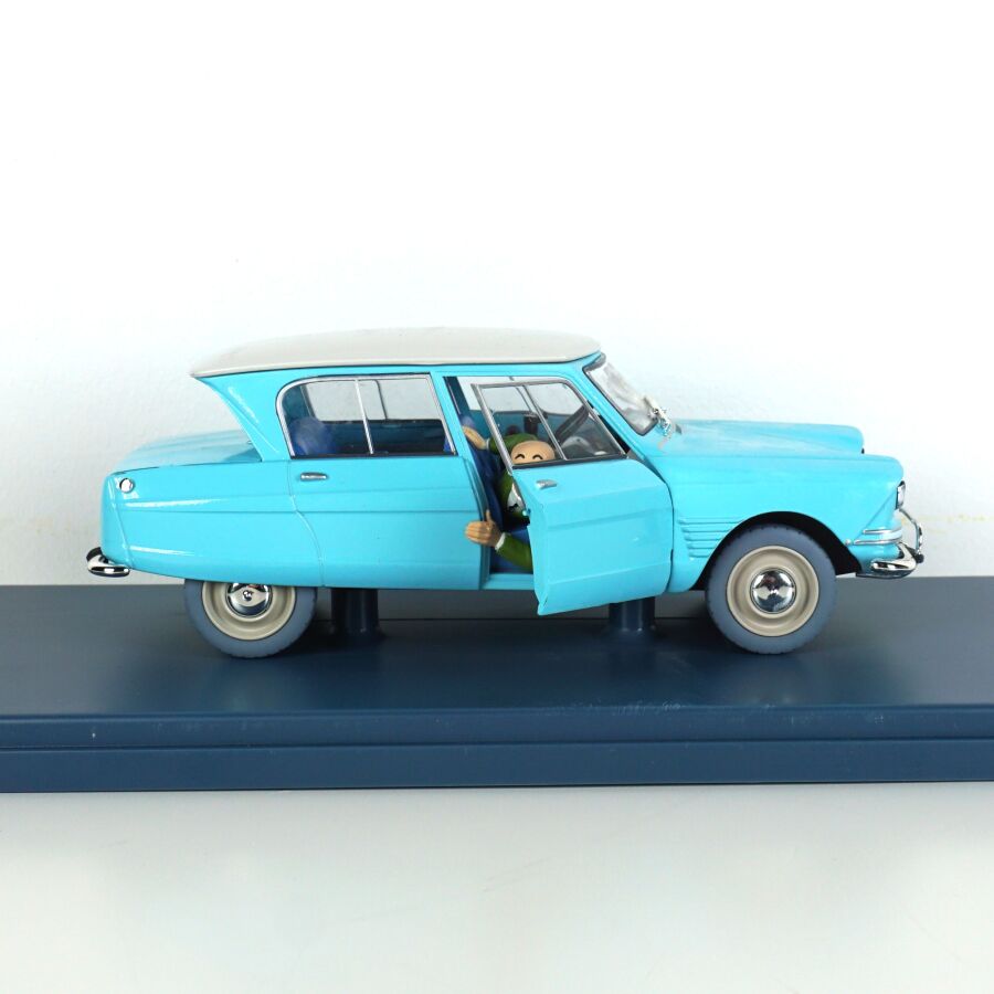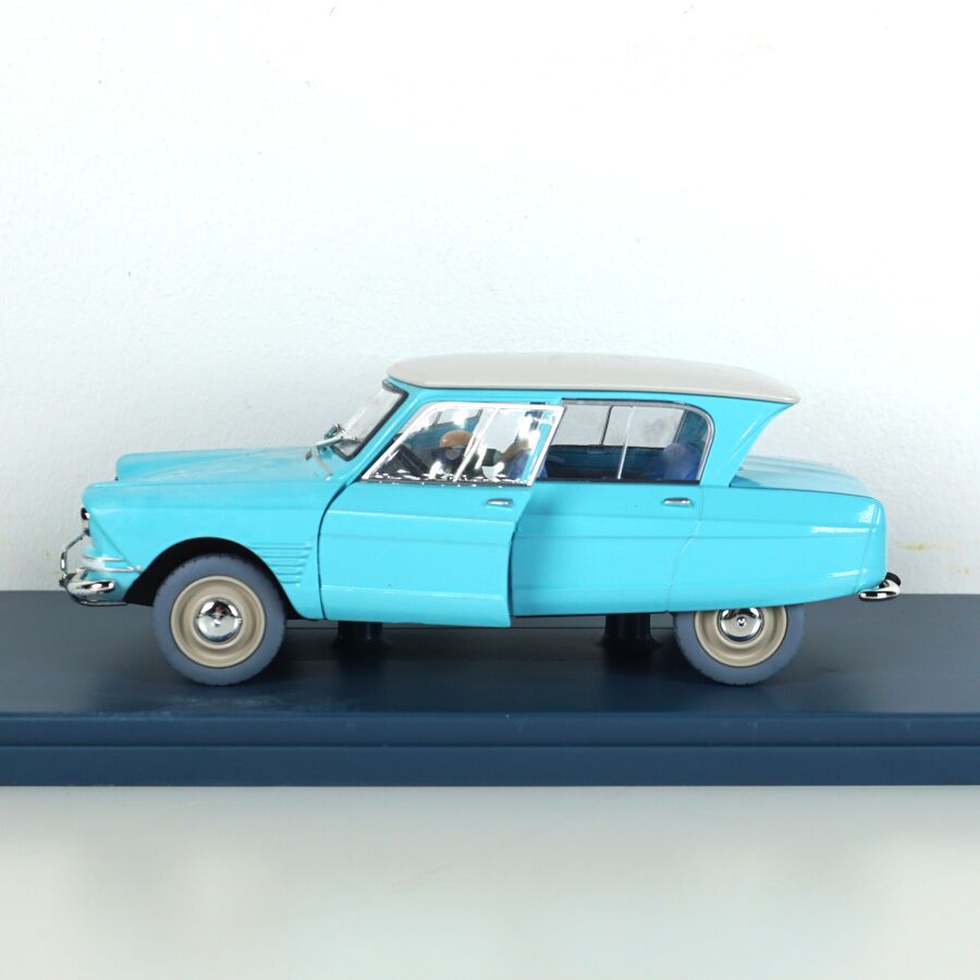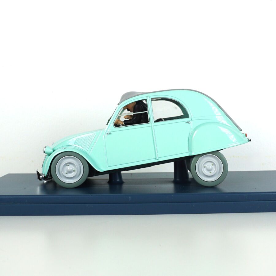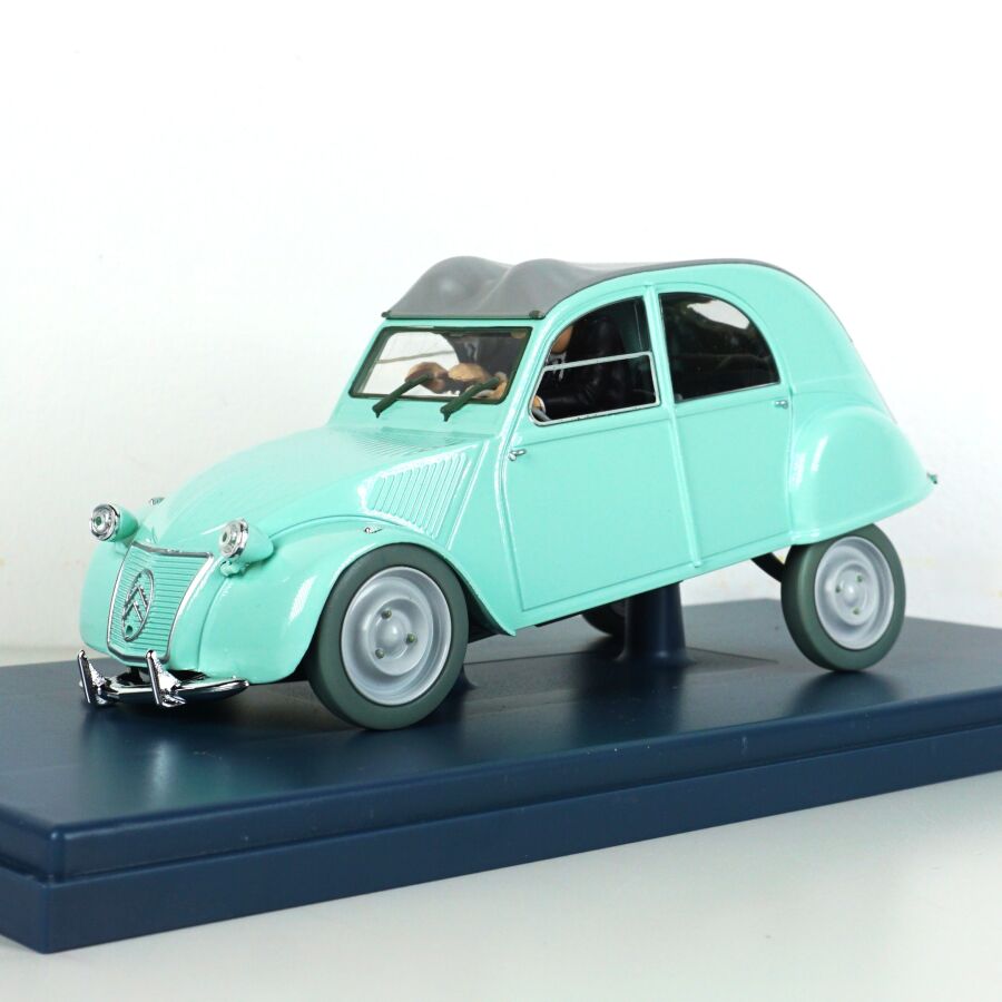 Éditions MOULINSART - HACHETTE : Ensemble de 3 véhicules "Les voitures de Tintin", échelle 1/24ème, comprenant (1) La 2CV des Dupont, "L'affaire Tournesol", réf. 29808, turquoise ; (1) L'ami 6 du docteur, "Les bijoux de la Castafiore", réf. 29818, bleue et (1) La 2CV cassée, "Les bijoux de la Castafiore", réf. 29811, turquoise, présentés dans leur boite vitrine et accompagnés du fascicule explicatif.