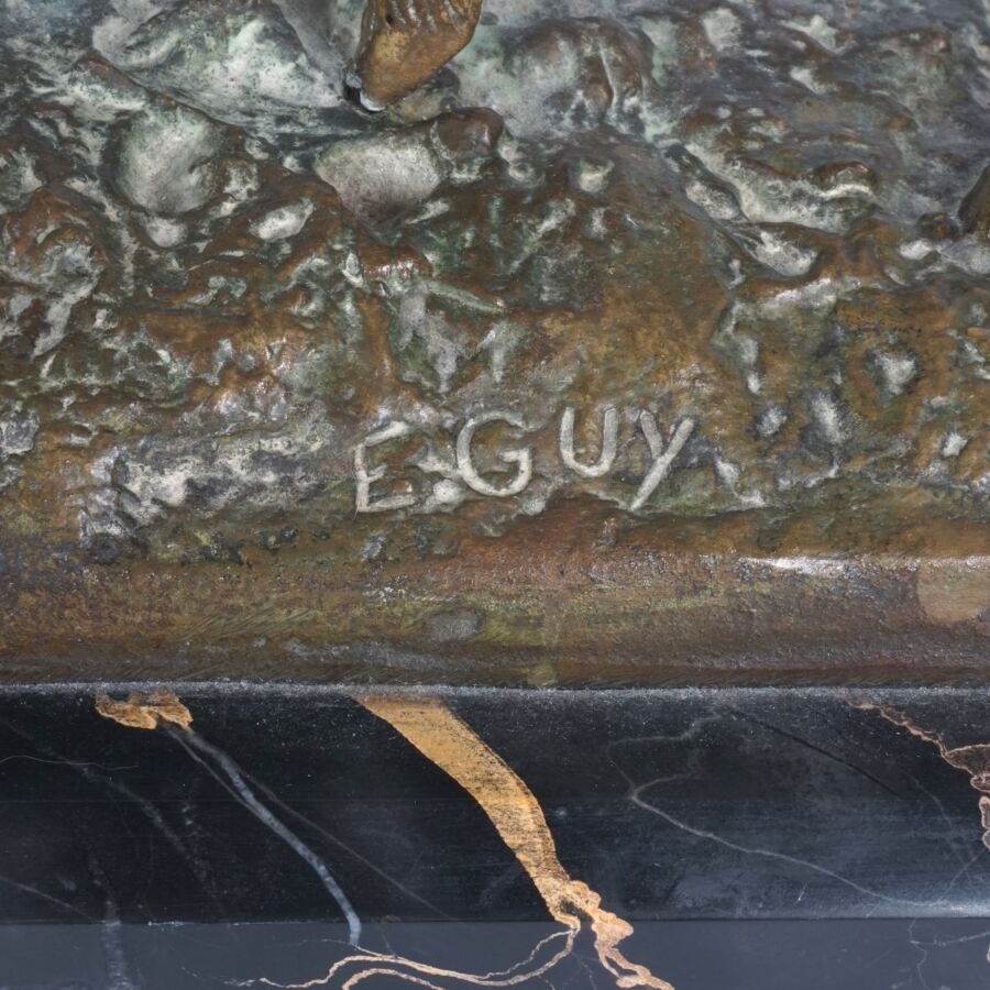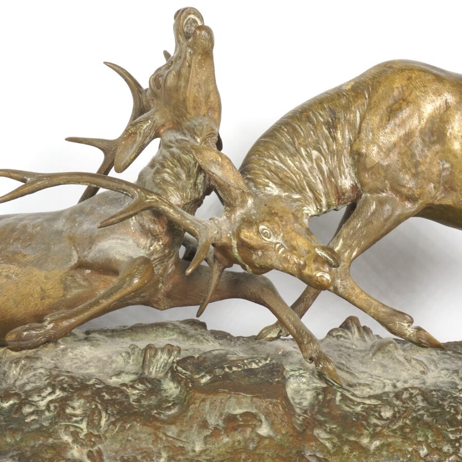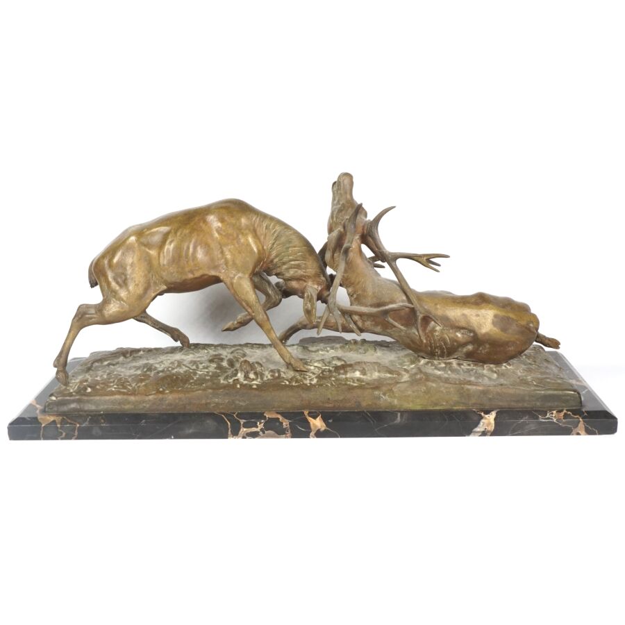 Edouard-Guy Comte DU PASSAGE (1872-1925), "Combat de cerfs", groupe en bronze à patine médaille nuancée vert, signé en creux sur la terrasse, présenté sur un socle rectangulaire en marbre portor, H. 23 cm. L. 56 cm (légères égrenures).