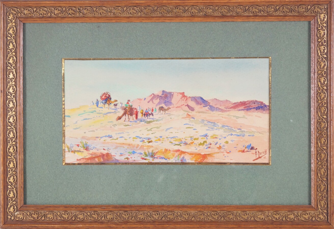 Edouard HERZIG (1860-1926), "Caravane dans le désert" 16, dessin au crayon et aquarelle sur papier signé et daté en bas à droite, 14,5 x 29 cm (à vue) (papier légèrement gondolé).