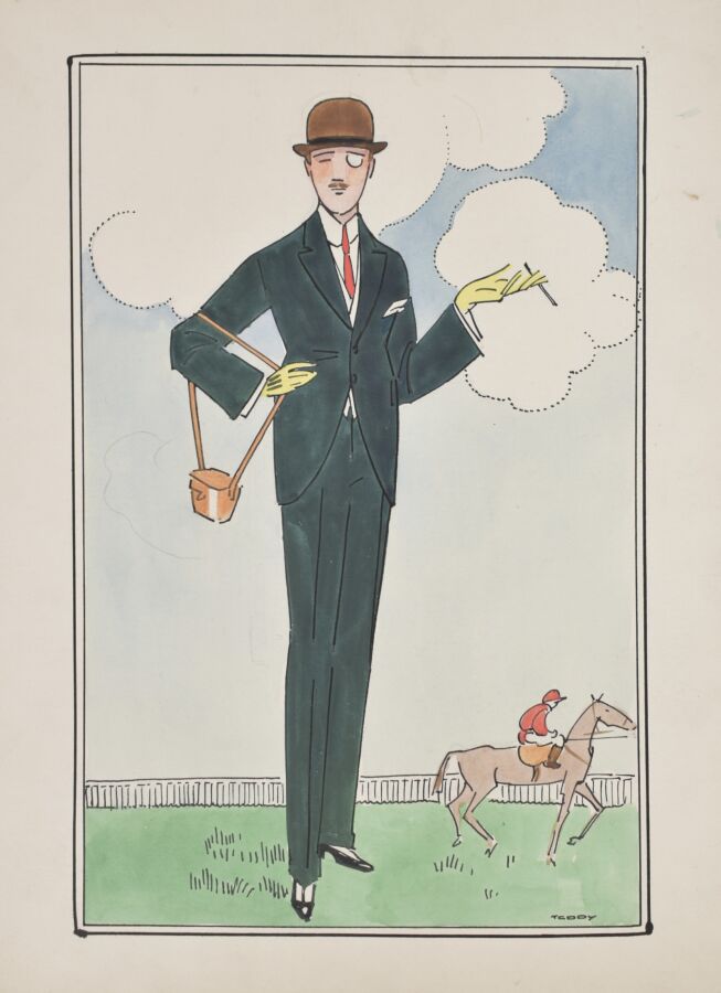 Edouard SAUNIER (1885-1918), "Aux courses", gouache sur papier fort, signée en bas à droite, encadré, 33 x 25 cm.