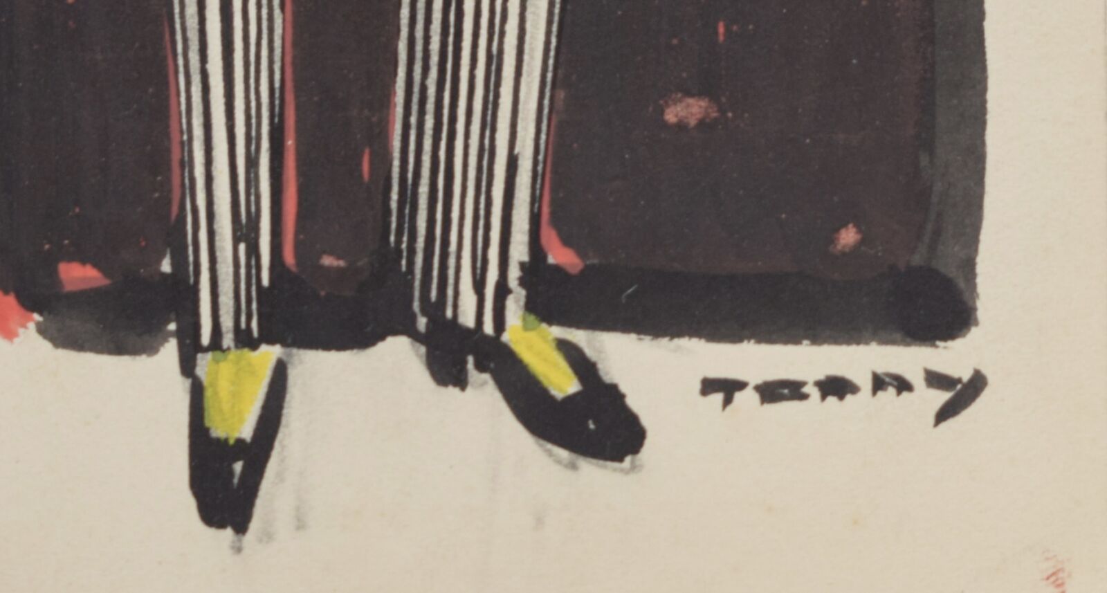 Edouard SAUNIER (1885-1918), "C'est ici !!", gouache sur papier fort, signée en bas à droite, encadrée, 33 x 24.5 cm.