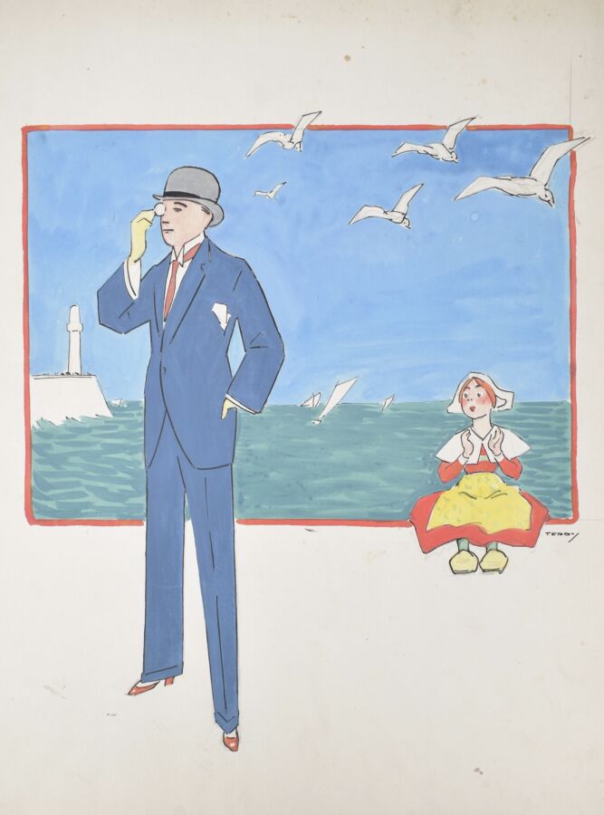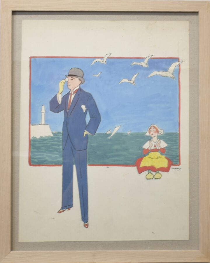 Edouard SAUNIER (1885-1918), "Devant le phare!", dessin, gouache et aquarelle sur papier fort, signée en bas à droite, encadré, 41 x 30 cm.