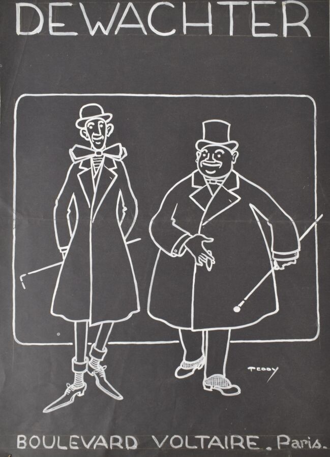 Edouard SAUNIER (1885-1918), "DEWACHTER", gouache blanche sur papier noir, signée en bas à droite, cachet d'atelier au dos, encadrée, 40 x 28.5 cm.