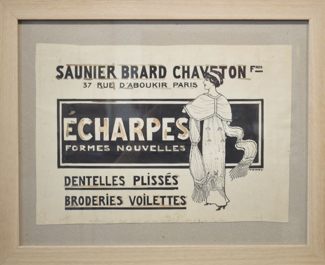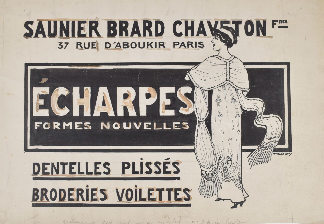 Ses créations publicitaires couvrent des domaines variés : restauration, chapellerie, mode, chaussures, optique et pneumatiques. Elles sont généralement signées de son pseudonyme « Teddy » ou accompagnées d'un cachet d'atelier « Edouard Saunier, dessins artistiques » ou un timbre au monogramme ES. Parmi les marques figurent les chapeliers Henry, Léon et Rochet, le magasin de jouets Le Paradis des Enfants, les chaussures UNIC, Caveryrac et Raoul, les filtres Maignen, les pneumatiques Wolber et Lucifer, ainsi que les tailleurs Boka, Dewachter, Lejeune et Libby.