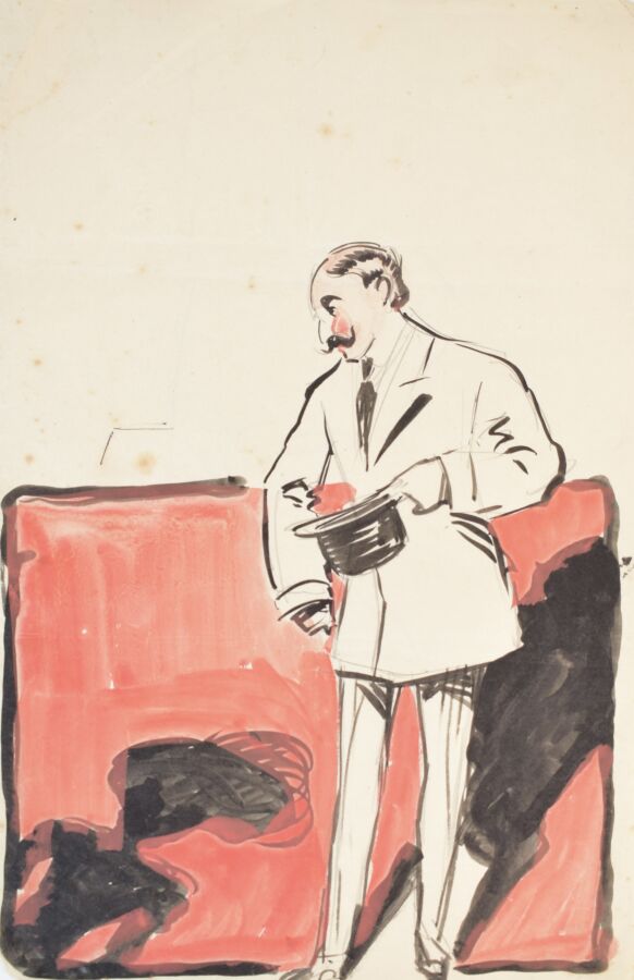 Edouard SAUNIER (1885-1918), "Elegance, chapeau bas !", dessin et aquarelle sur papier calque, 31 x 20 cm.
