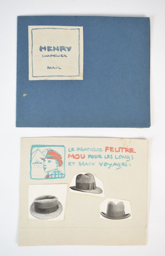 Edouard SAUNIER (1885-1918), "Henry, chapelier, Paris", ensemble de quatre dessins et aquarelles sur papier, collage, 12 x 14.5 cm.