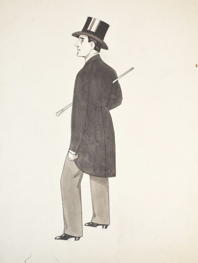 Edouard SAUNIER (1885-1918), "Jachet, Haut-de-Forme et Canne", dessin à l'encre et lavis d'encre, 32.5 x 25 cm.