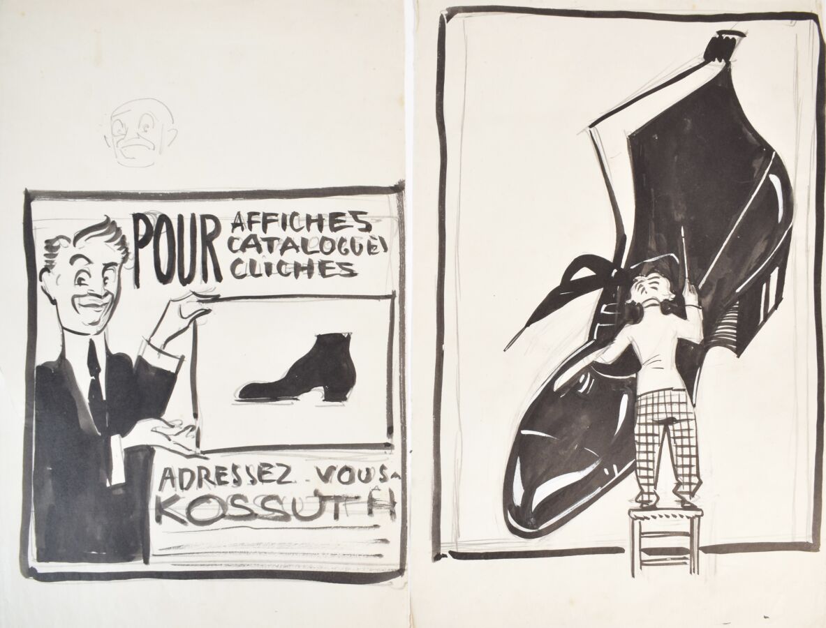 Edouard SAUNIER (1885-1918), "KOSSUTH & CIE", deux dessins à l'encre et lavis d'encre sur papier, 32 x 19 cm.