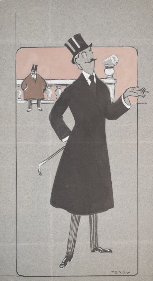 Edouard SAUNIER (1885-1918), "La mode en Haut-de-Forme", dessin à l'encre et réhauts de gouache blanc, 27.5 x 15 cm.