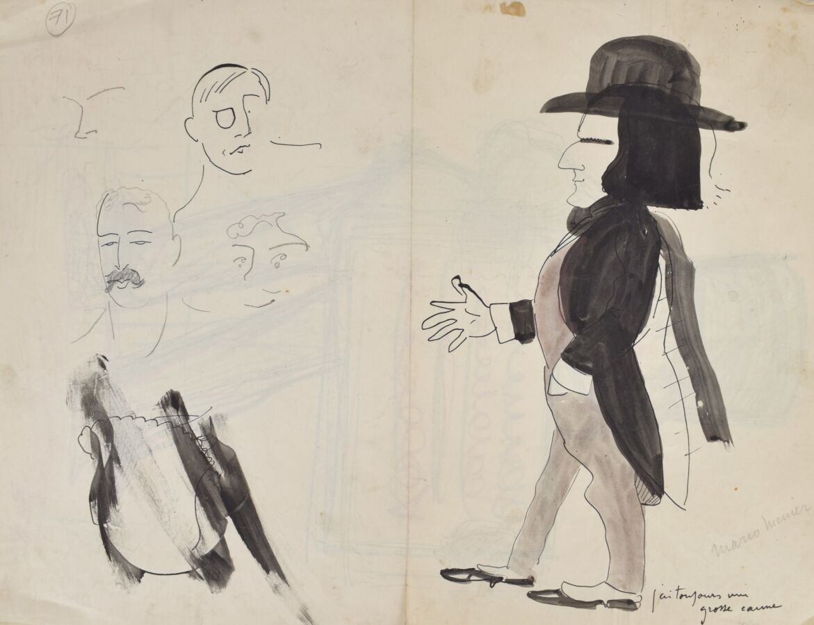 Edouard SAUNIER (1885-1918), "LE GROOM, QUEUE DE PIE ET HAUT-DE-FORME", dessins double face, crayons de calam et encre sur papier calque, encadré, 40 x 30 cm.