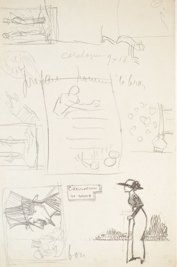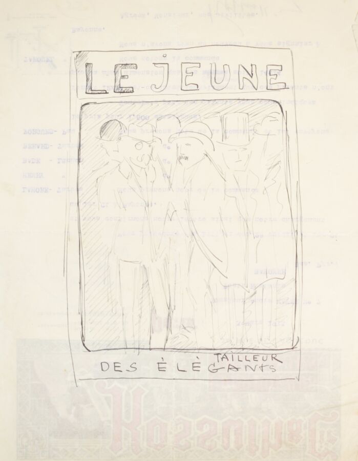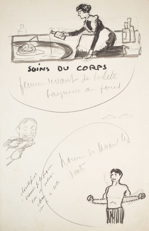 Edouard SAUNIER (1885-1918), "LE JEUNE, Tailleur des élégants" et "Soins du corps", dessin à l'encre sur papier, 27.5 x 21 cm et 30 x 20 cm.