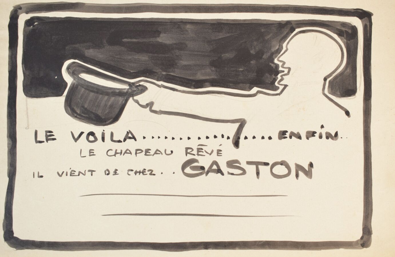 Edouard SAUNIER (1885-1918), "Le Voila... ENFIN, le chapeau rêvé…", encre et lavis d'encre sur papier calque, 19.5 x 31 cm.
