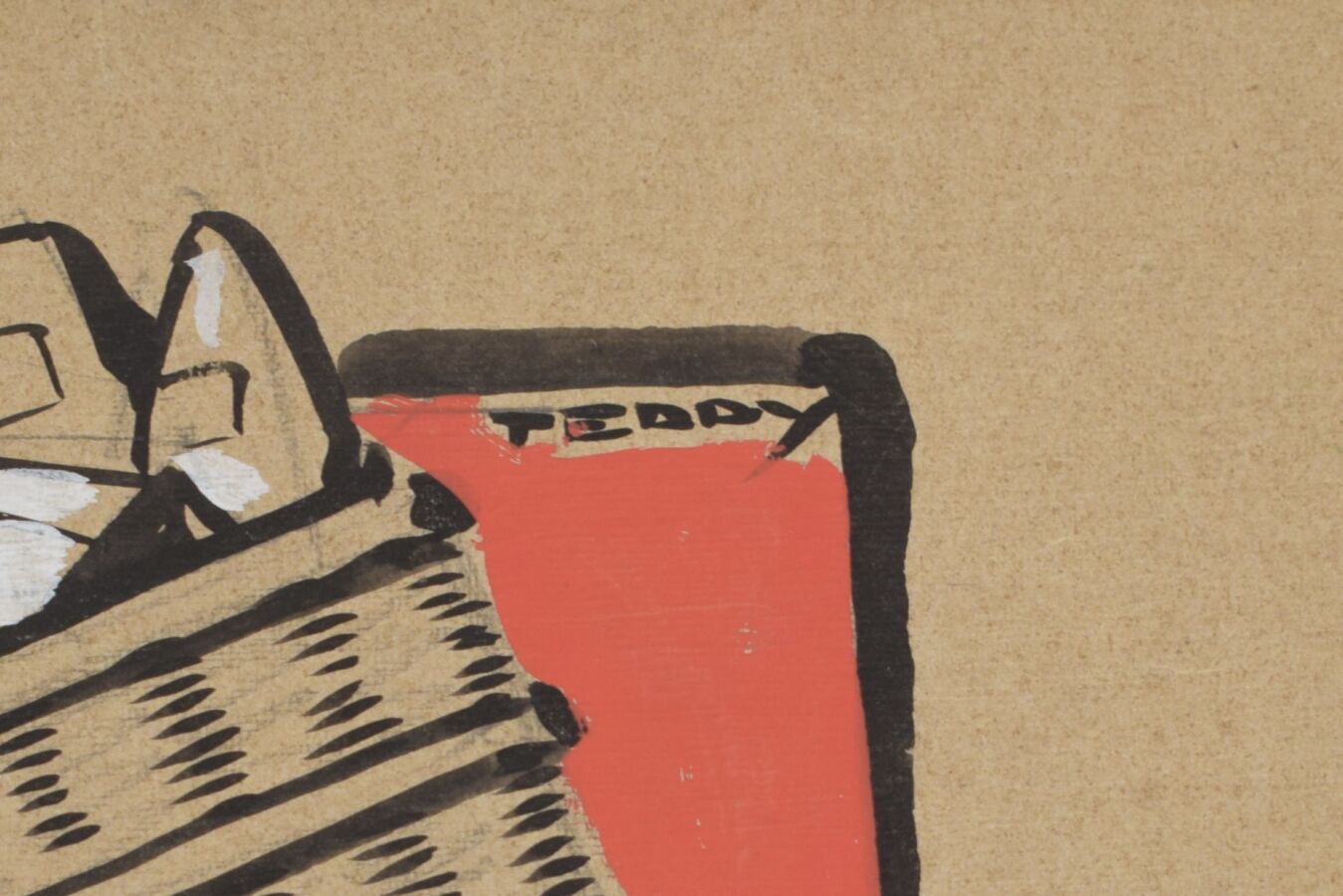 Edouard SAUNIER (1885-1918), "L'Epicier, malheureux!...", gouache sur papier brun, signée en haut à droite, encadrée, 32 x 26 cm.