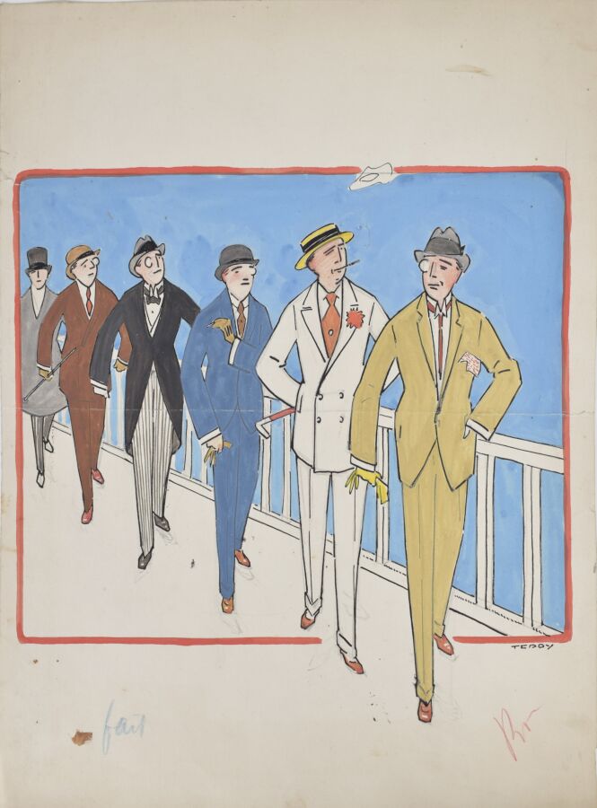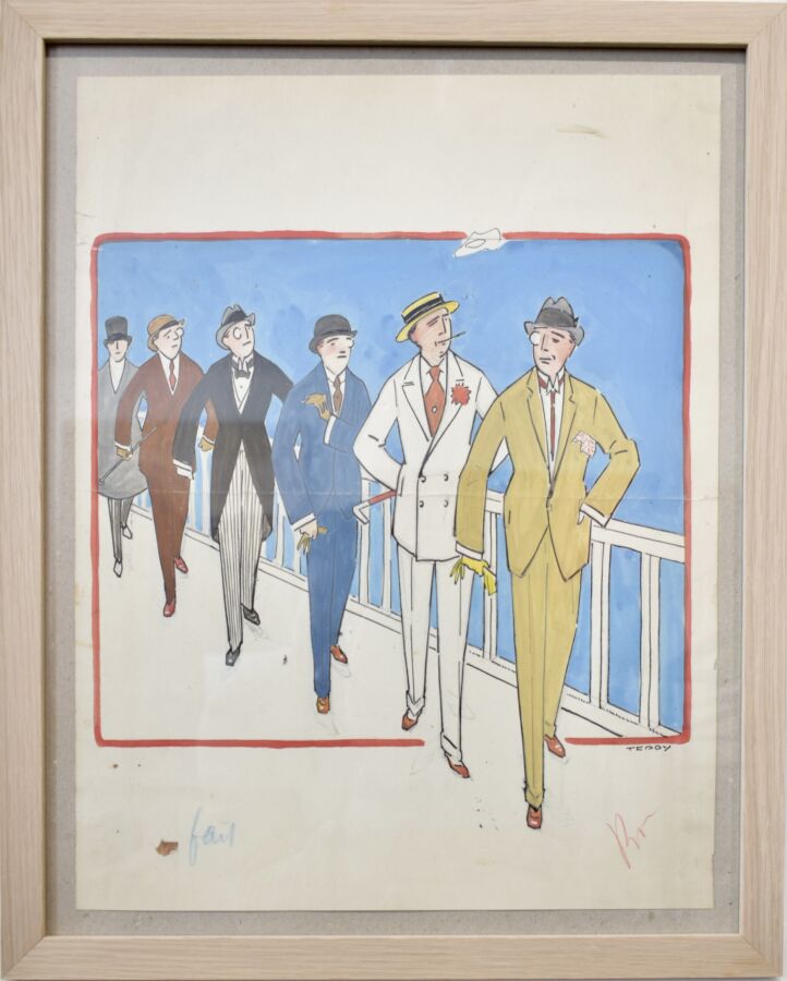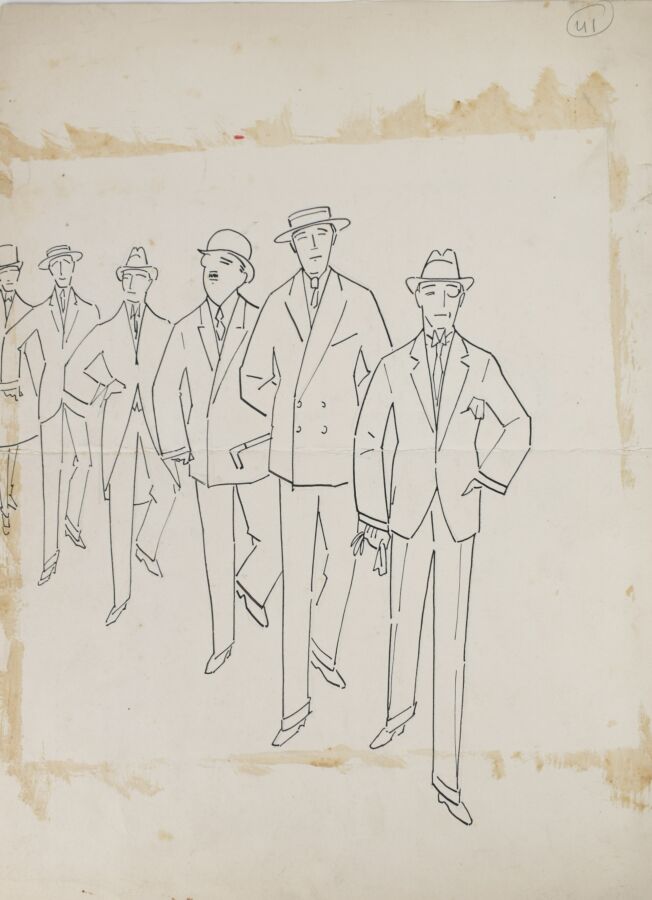 Edouard SAUNIER (1885-1918), "Les Elegants", dessin, double face, gouache et aquarelle sur papier fort, signé en bas à droite, encadré, 41 x 30 cm.
