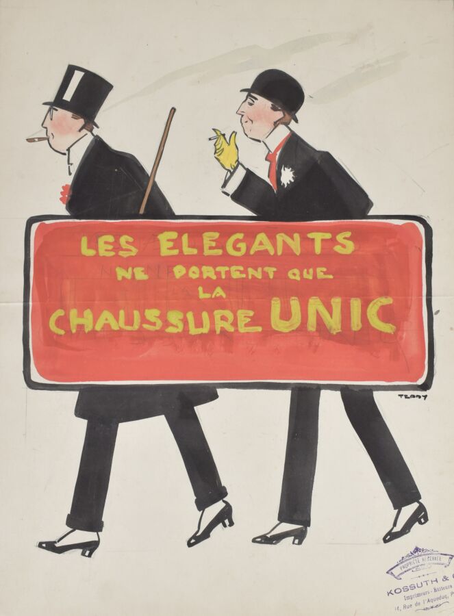Edouard SAUNIER (1885-1918), "Les Elegants ne portent que la CHAUSSURE UNIC", dessin, gouache et aquarelle sur papier fort, 41 x 30 cm.