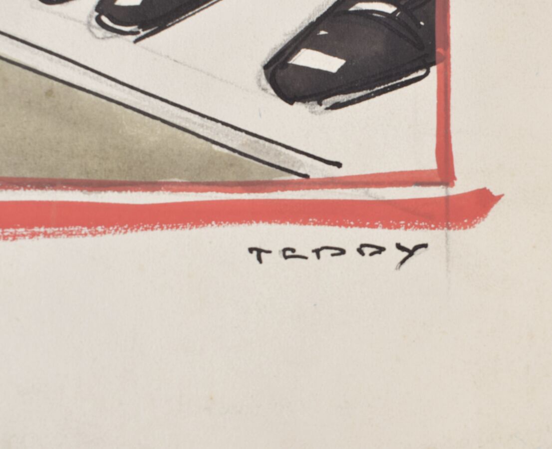 Edouard SAUNIER (1885-1918), "L'étalage, chaussures pour femmes", gouache sur papier fort, signée en bas à droite, encadré, 28 x 28 cm.
