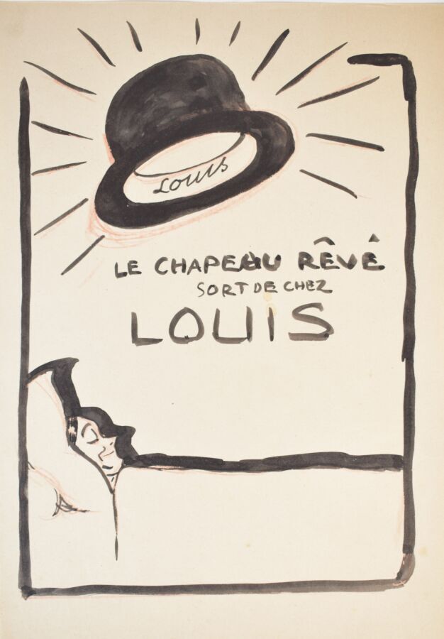 Edouard SAUNIER (1885-1918), "Louis : Le chapeau rêve sort de chez vous", dessin à l'encre et aquarelle sur papier, non signé, 32 x 30 cm.