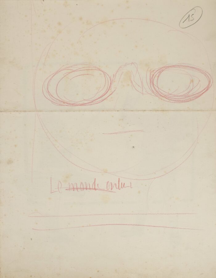 Edouard SAUNIER (1885-1918), "Nouvelles lunettes!", dessin, aquarelle et gouache sur papier fort, signé en bas à gauche, 40 x 31 cm.