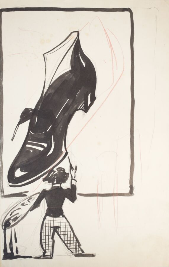 Edouard SAUNIER (1885-1918), "Peintre à la palette et soulier noir", dessin à l'encre et lavis d'encre, 31 x 20 cm.