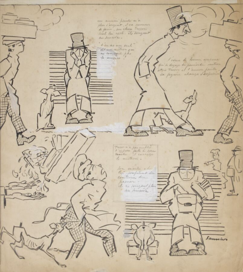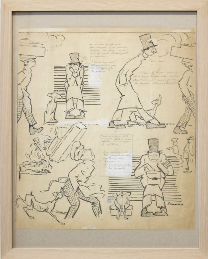 Edouard SAUNIER (1885-1918), "Peintres nécessiteux", dessin à l'encre sur papier, signé en bas à droite, encadré, 36 x 32 cm.