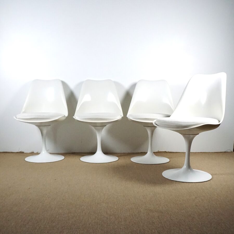 Eero SAARINEN (1910-1961) éd. KNOLL : Suite de quatre chaises, modèle "Tulip", coque en fibre de verre blanc cassé, reposant sur un piétement fixe central en fonte d'aluminium, présentées avec ses galettes probablement d'origine, présentées avec deux sacs de protection logotés, H. 80 cm (tâches, rayures d'usage).