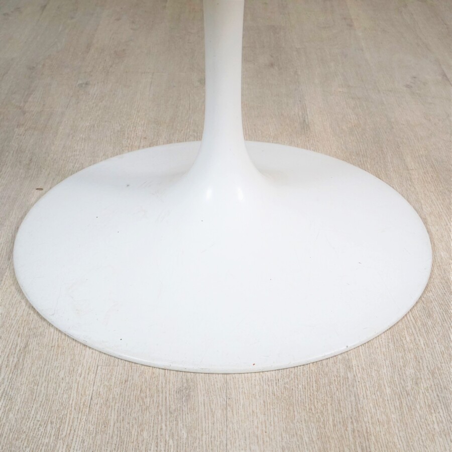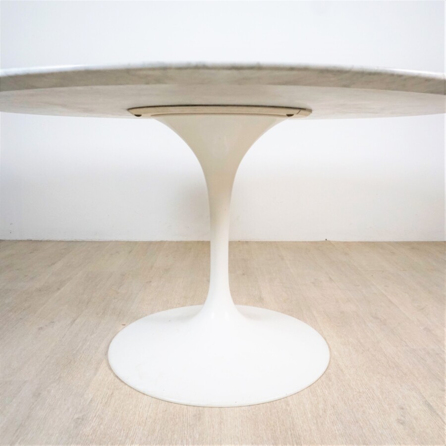 Eero SAARINEN (1910-1961) : Mobilier de salle à manger "Tulip" comprenant une grande table ronde, plateau en marbre blanc veiné gris, piètement en fonte d'aluminium laqué blanc et quatre chaises dont une pivotante, piètement en fonte d'aluminium gainé de Rilsan blanc, les coques en fibre de verre thermoformée et laquées blanc, les assises garnies d'une galette tapissée ocre, modèle créé en 1956, table marquée " Knoll International" sous le pied, H. Table : 72.2 cm. Diam : 137.5 cm. H. Chaises : 80.5 cm (petites traces légères au piètement).
