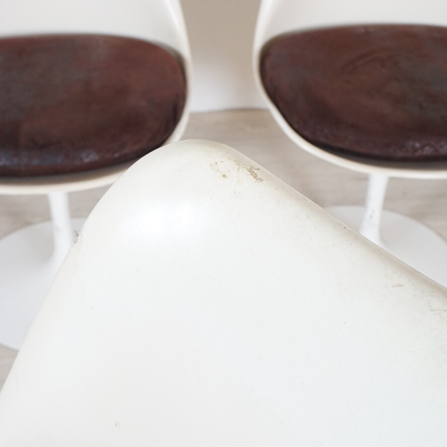 Eero SAARINEN (1910-1961) : Suite de quatre chaises modèle "Tulipe" en fonte d'aluminium et coque en plastique, les galettes d'assises marron avec tissu auto-agrippant, H.80 cm (usures au tissu, petits chocs, rayures, usure au vernis des coques).