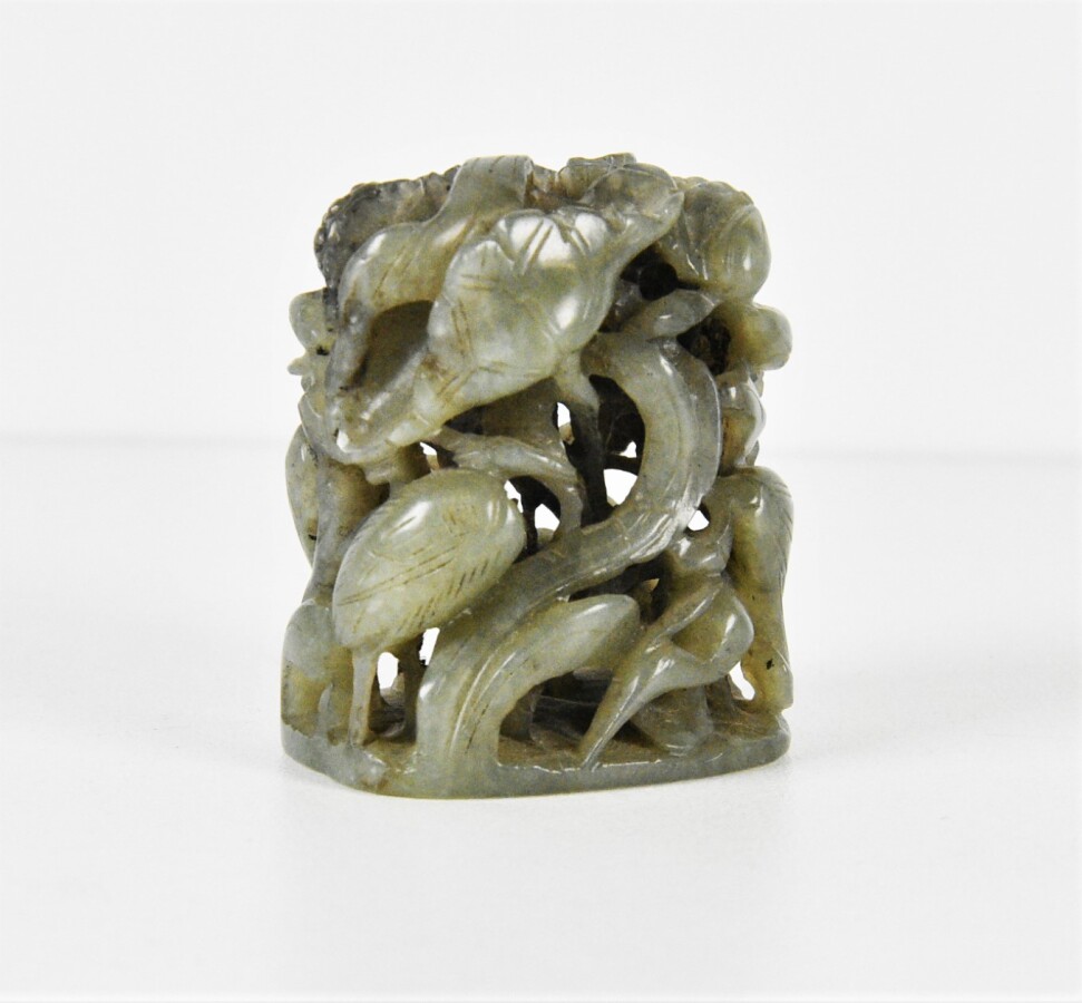 Elément de coiffe en jade céladon foncé, finement sculptée et ajourée d'échassiers évoluant parmi des lotus, Chine, 18e siècle, H. 4.2 cm.