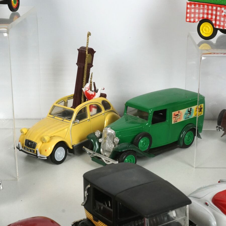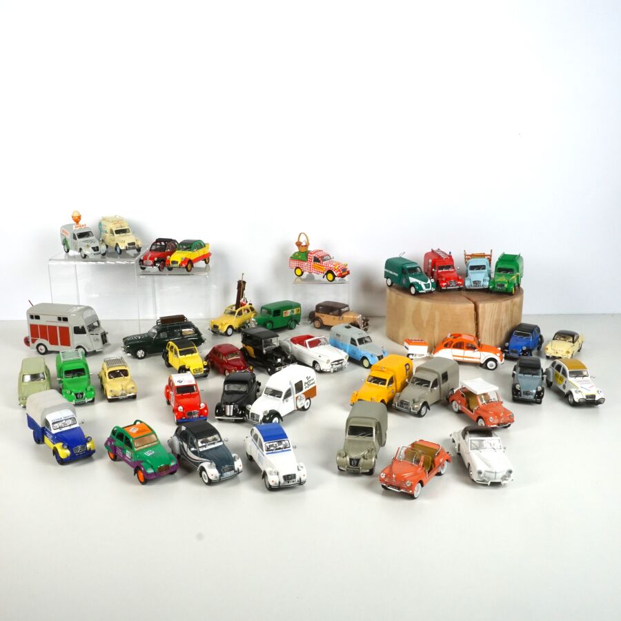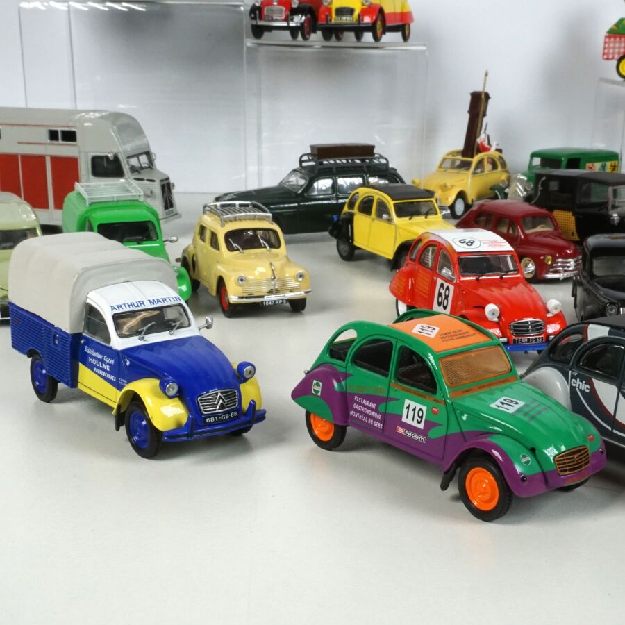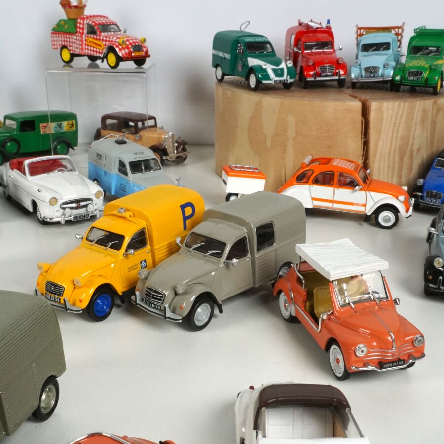 ELIGOR : Ensemble de 40 véhicules, échelle 1/43ème, comprenant notamment (1) Renault 4, crème avec galerie de toit ; (1) Renault Frégate cabriolet blanche, intérieur rouge ; (1) Citroën 2CV décapotable, blanche et orange, avec sa remorque ; (1) Camionnette publicitaire "Cochonou" Citroën 2CV ; (1) Taxi Citroën Berline Rosalie 1933, réf. 1005, beige et marron ; (1) Renault 4CV rouge ; et divers (quelques usures et écaillures).