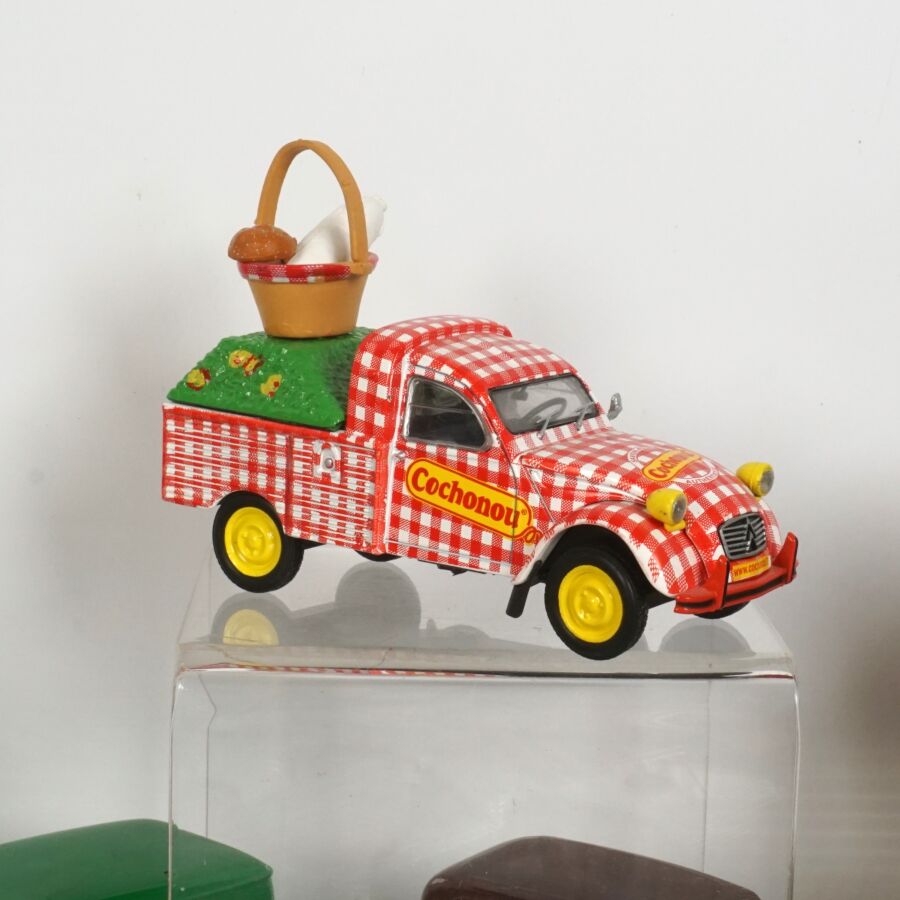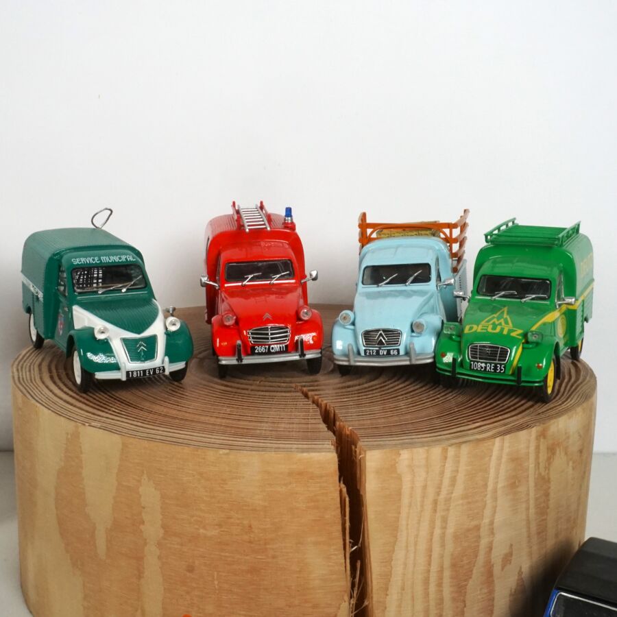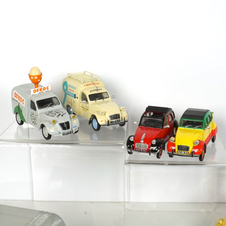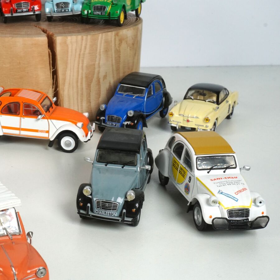 ELIGOR : Ensemble de 40 véhicules, échelle 1/43ème, comprenant notamment (1) Renault 4, crème avec galerie de toit ; (1) Renault Frégate cabriolet blanche, intérieur rouge ; (1) Citroën 2CV décapotable, blanche et orange, avec sa remorque ; (1) Camionnette publicitaire "Cochonou" Citroën 2CV ; (1) Taxi Citroën Berline Rosalie 1933, réf. 1005, beige et marron ; (1) Renault 4CV rouge ; et divers (quelques usures et écaillures).