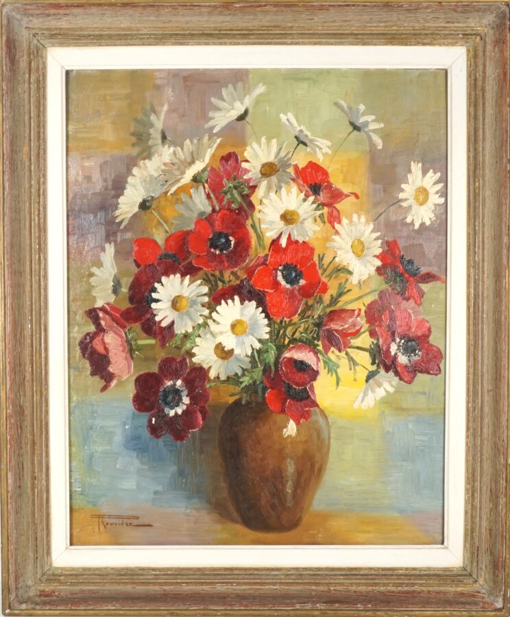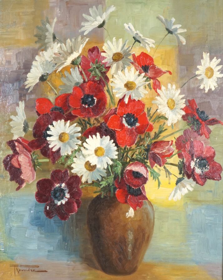 Elisabeth ROUVIERE (XXe), "Vase de fleurs des champs", huile sur panneau, signée en bas à gauche, 53 x 42 cm.