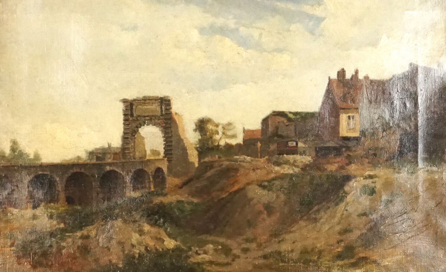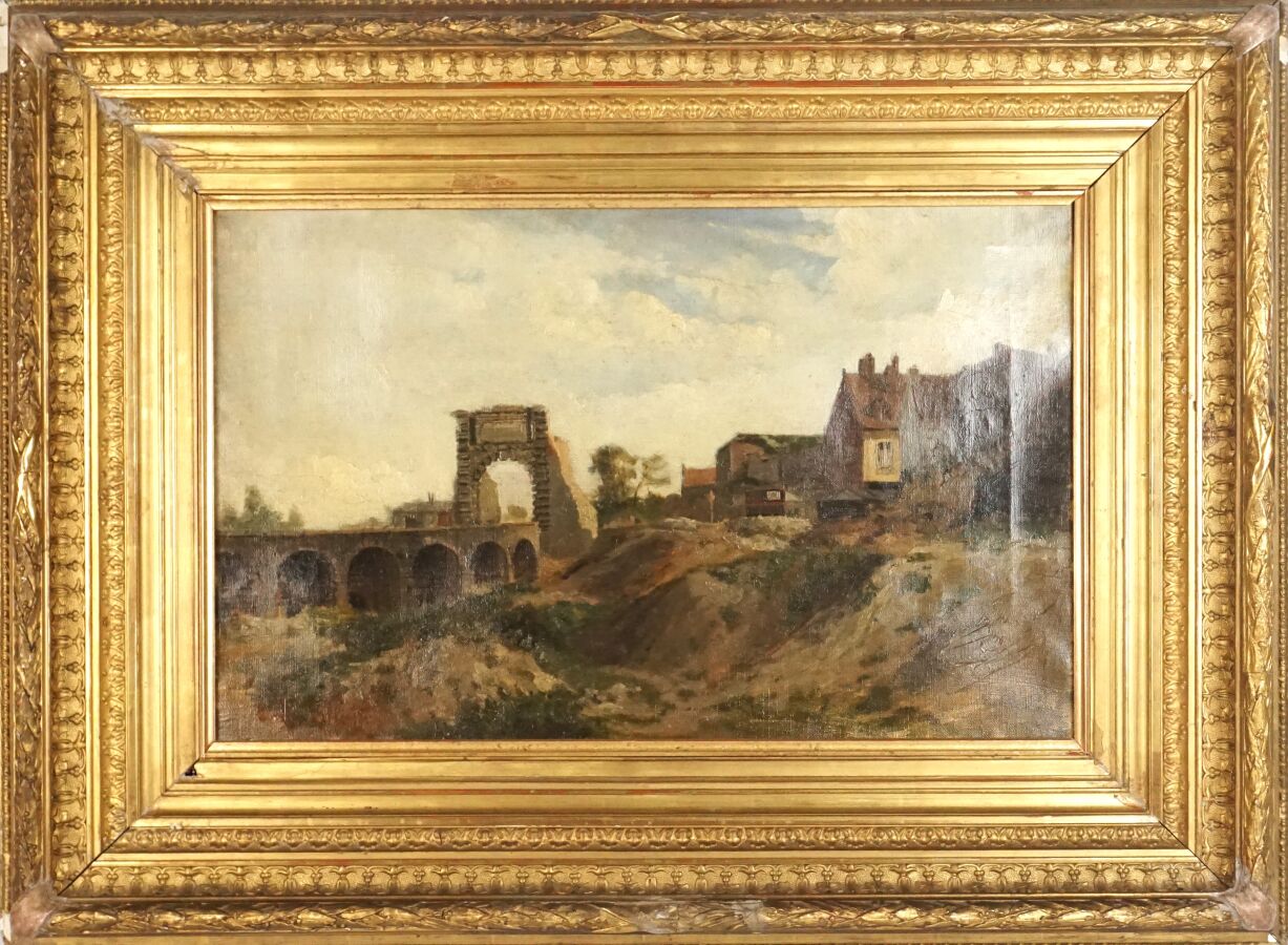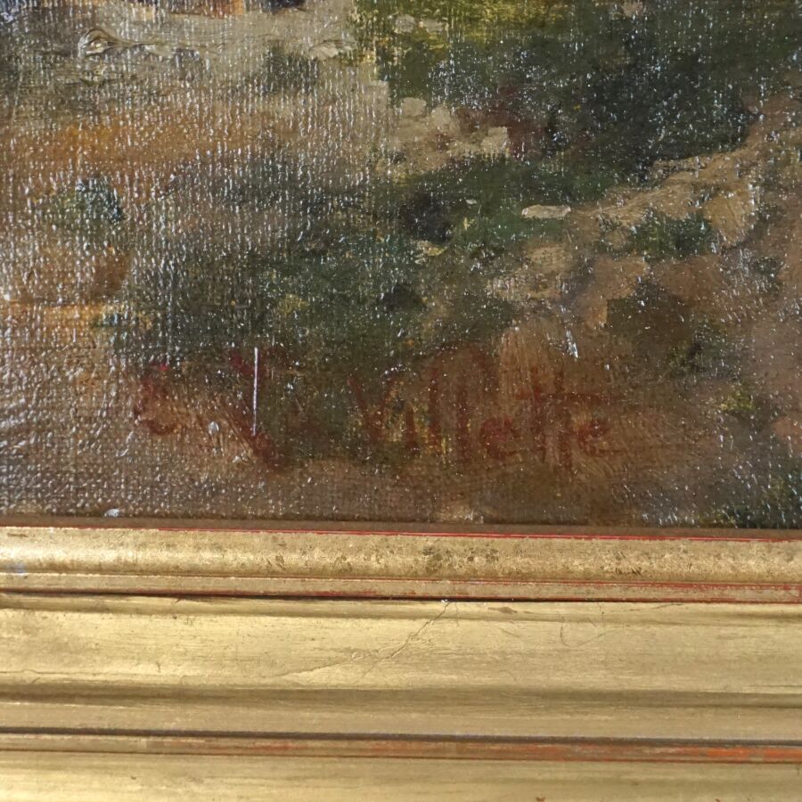 Elodie LA VILLETTE (1843-1917), "Le pont", huile sur toile signée en bas à gauche, 29.5 x 45.5 cm.