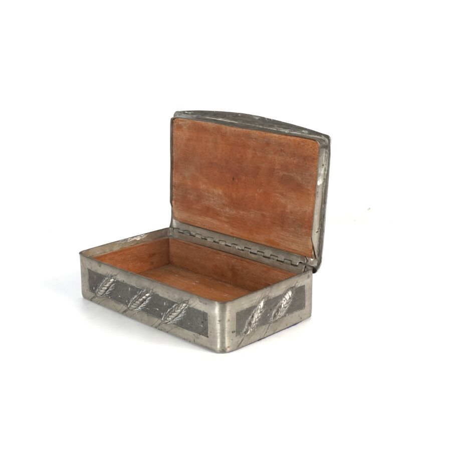 EMERAULT : Boite rectangulaire en étain, à décor de branches de framboisiers, signée, L. 16.5 cm (usures).