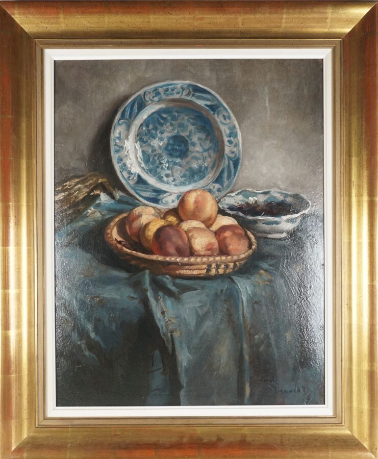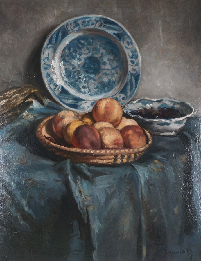Émile BERNARD (1868-1941), "Nature morte aux pêches et à la faïencerie de Delft" 1933, huile sur carton, signée et datée en bas à droite, 62 x 48 cm.