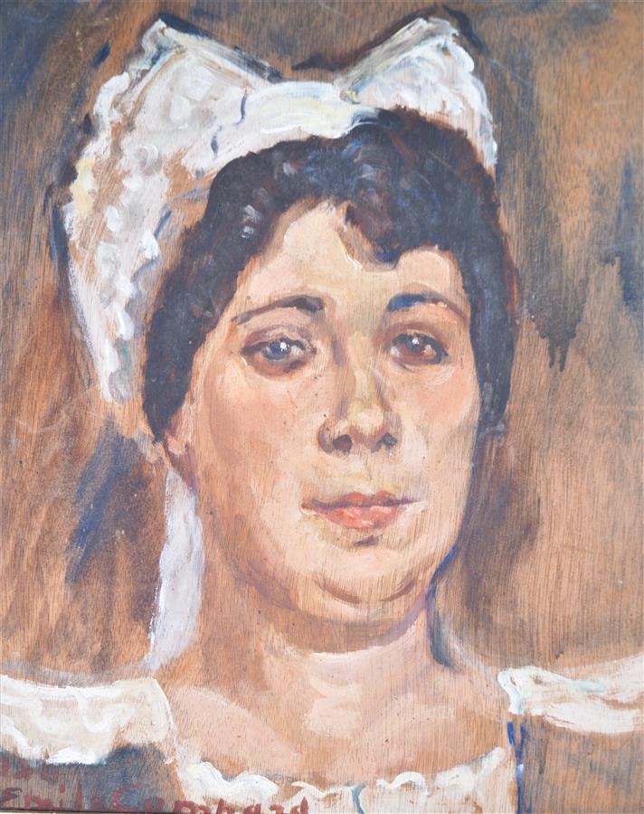 Emile COMPARD (1900-1977), "Portrait de Marie Rouard" 1951, huile sur panneau signée en bas à gauche, contresignée et datée au dos, présente un envoi "à un bon copain", 41 x 33 cm.