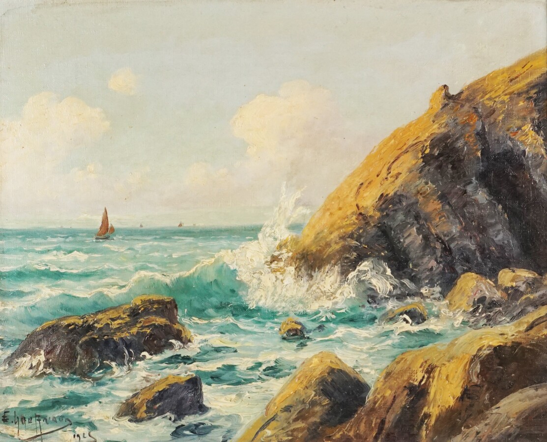 Emile GAUFFRIAUD (1877-1957), "Voiliers en bord de mer" 1925, huile sur toile signée et datée en bas à gauche, 33 x 41 cm.