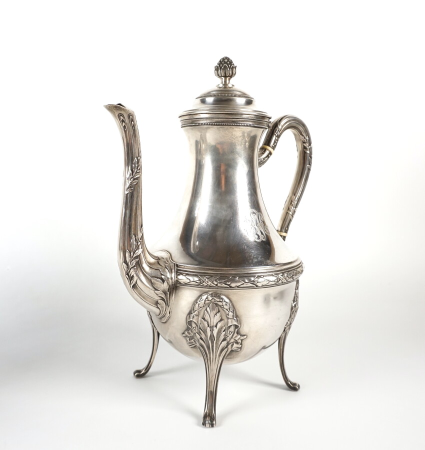 Emile PUIFORCAT : Service à thé et café 4 pièces de style Louis XVI, en argent massif, poinçon Minerve, comprenant théière, cafetière, pot à sucre et pot à lait, à décor de frises de lauriers, perles et godrons, chiffré "BH", les pieds feuillagés et ornés de rubans, le fretel formant une pomme de pin, H. de 13 à 27 cm. Poids brut : 2 100 g environ.
