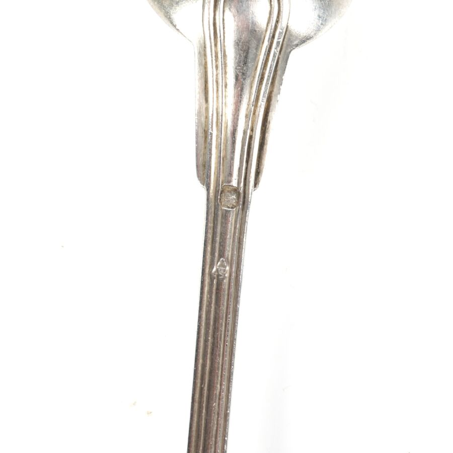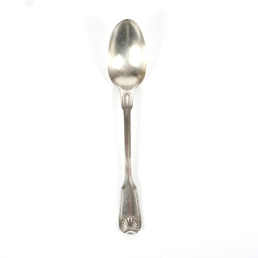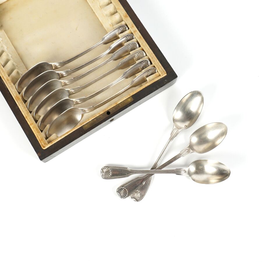 Emile PUIFORCAT : Suite de 9 cuillères en argent massif, poinçon Minerve 1er titre, modèle à la coquille, présentée en coffret, L. 14.5 cm. Poids brut : 220 g environ.
