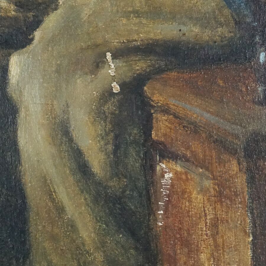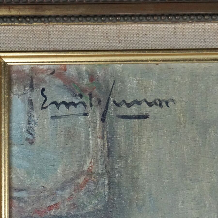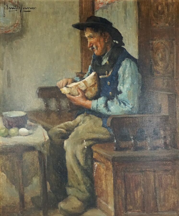 Émile SIMON (1870-1956), " Le repas breton", huile sur panneau signée en haut à gauche, 55 x 46 cm (manques).