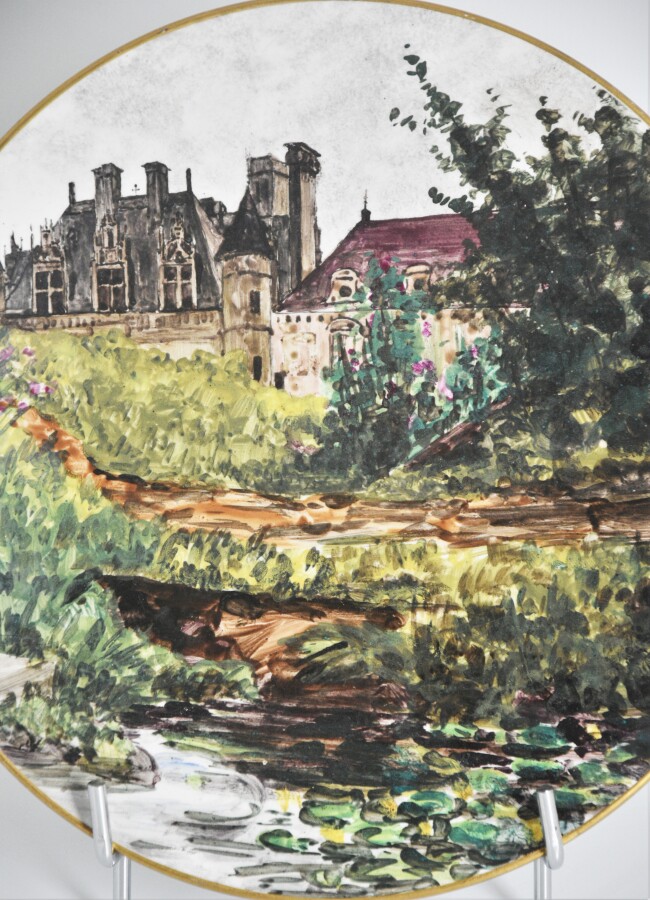 Emile SIMON (1890-1976), "Château au bord de rivière", huile sur porcelaine, signée au dos, D. 25.5 cm.