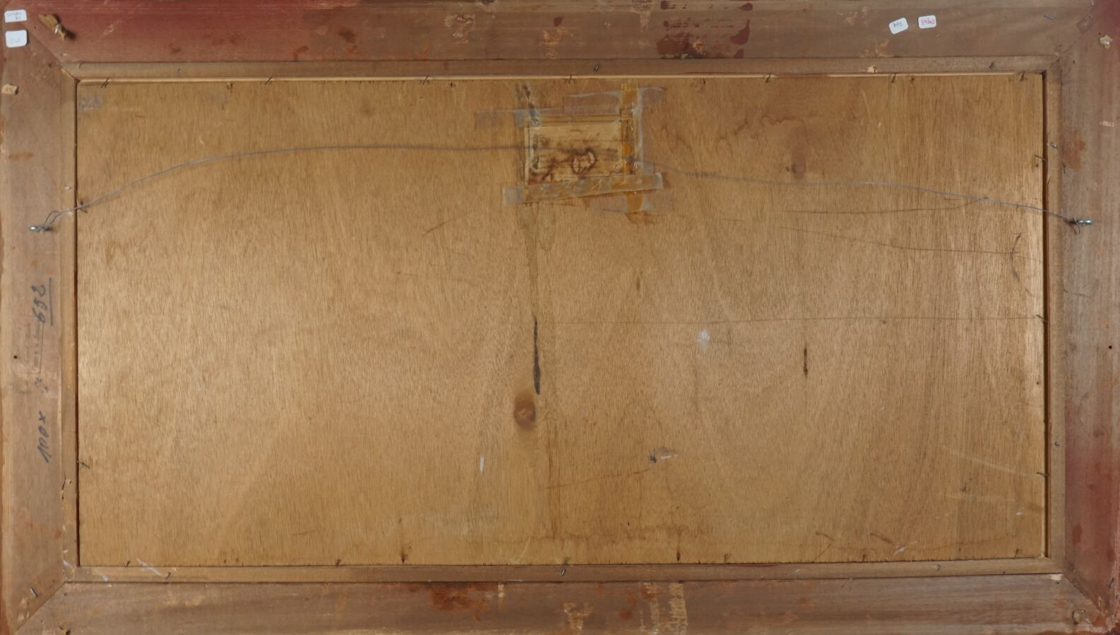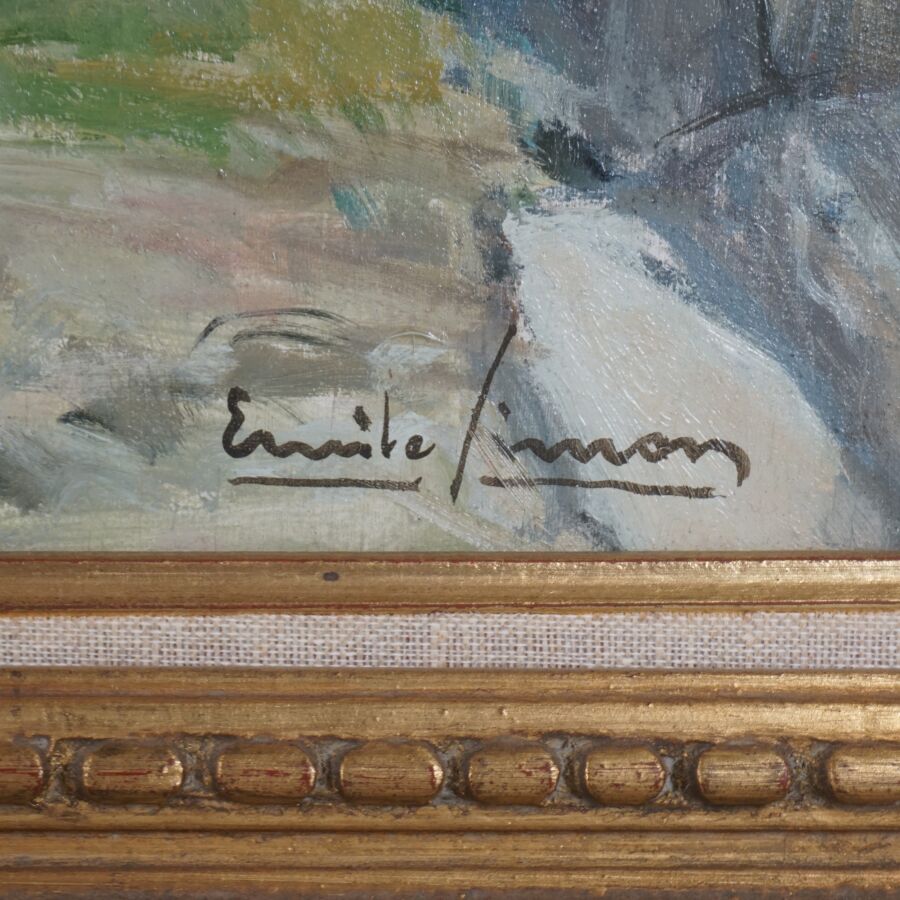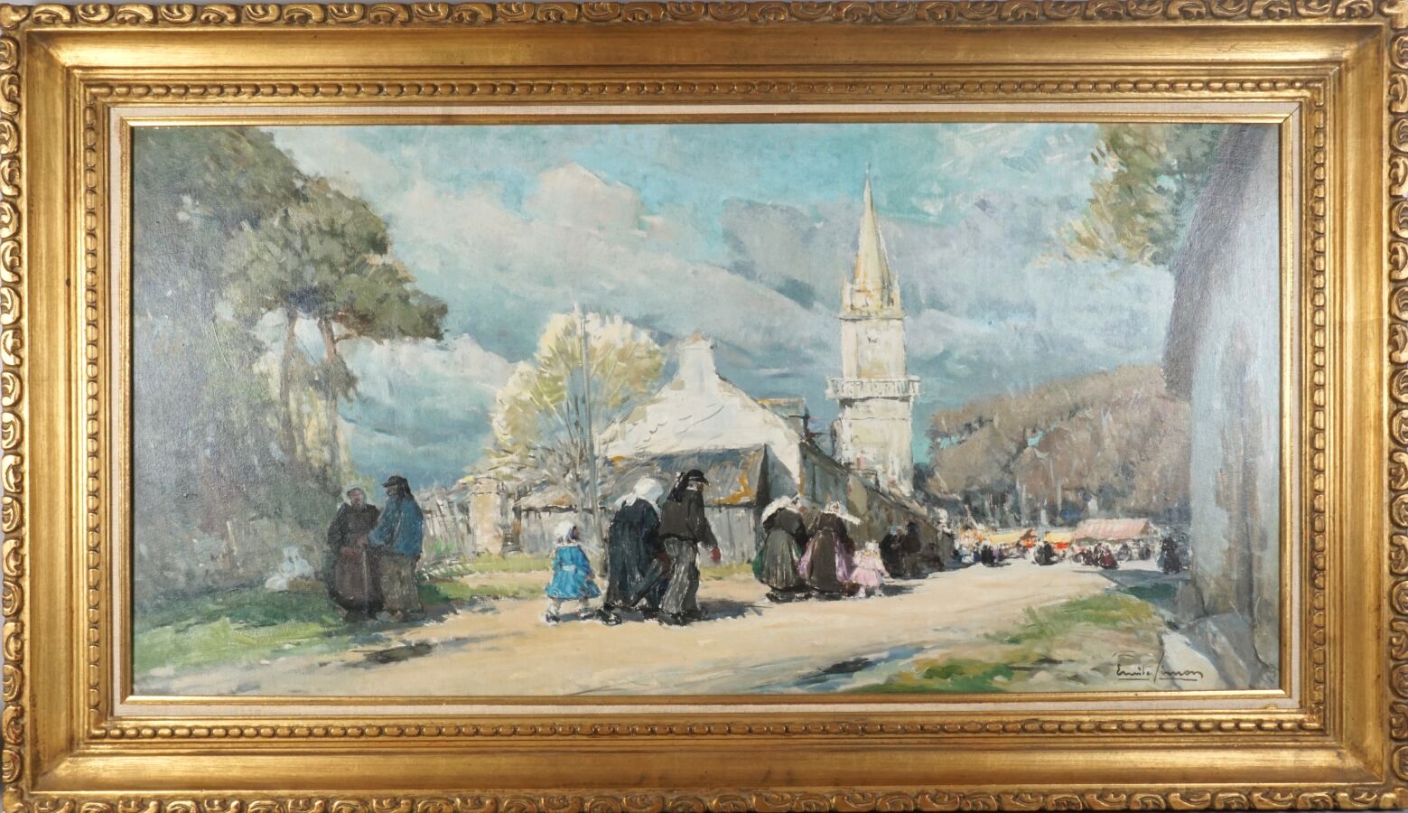Émile SIMON (1890-1976), "Fête à Pluméliau", huile sur panneau signée en bas à droite, située au dos, 50 x 100 cm.