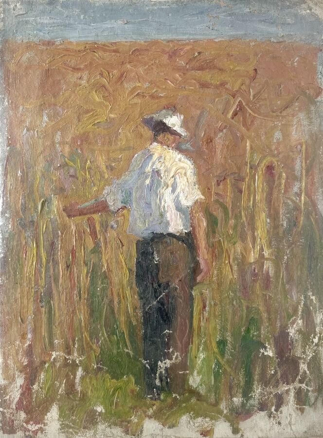 Emilio BOGGIO (1857-1920), "Paysan au chapeau", huile sur toile sans châssis, signée au dos, 34 x 25 cm. (craquelures et manques, présenté sous blister)