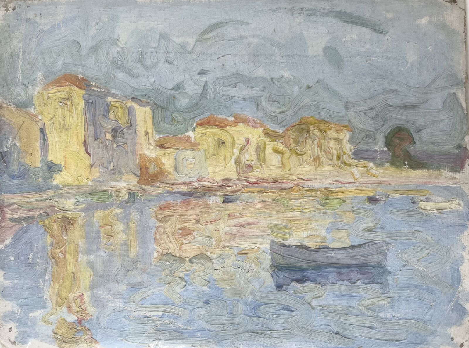 Emilio BOGGIO (1857-1920), "Port de Méditerranée" huile sur toile sans châssis, signée au dos, 26 x 34 cm (manques, présenté sous blister)